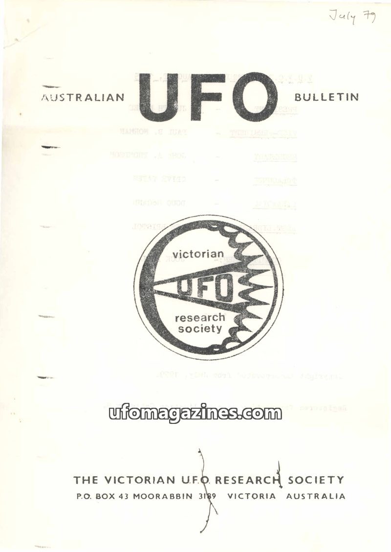 This issue of the Australian UFO Bulletin from July 1979 delves into various UFO phenomena. It features an analysis of the Roy Manifold photographs, which captured an anomalous obj