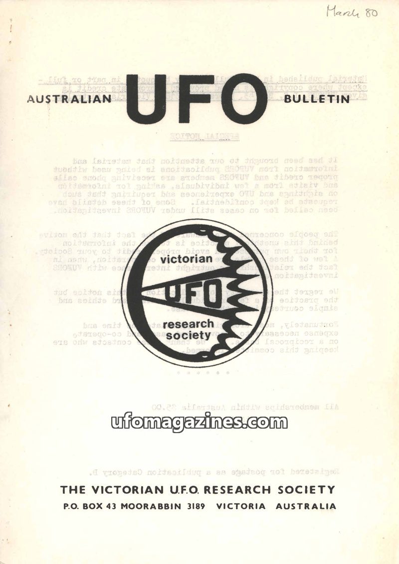 This issue of the Australian UFO Bulletin from March 1980 covers significant events in ufology, including the Bass Strait and Cook Strait flaps, and the disappearance of Frederick