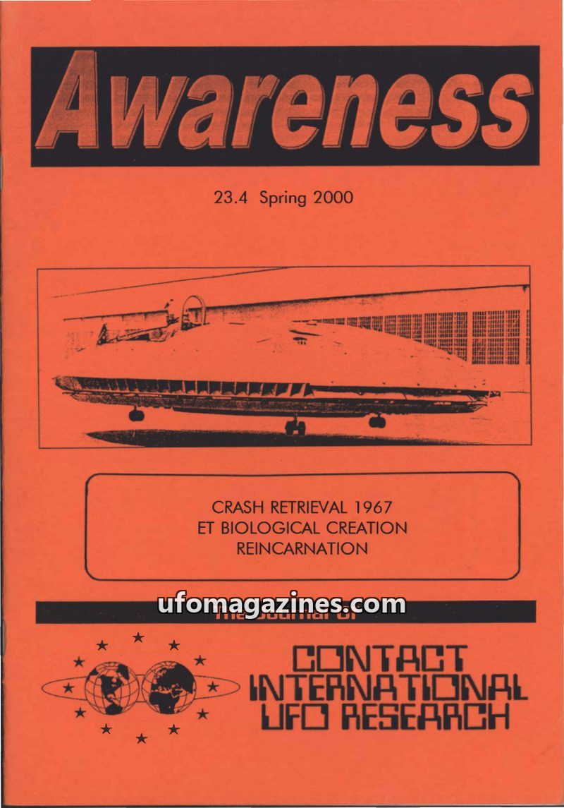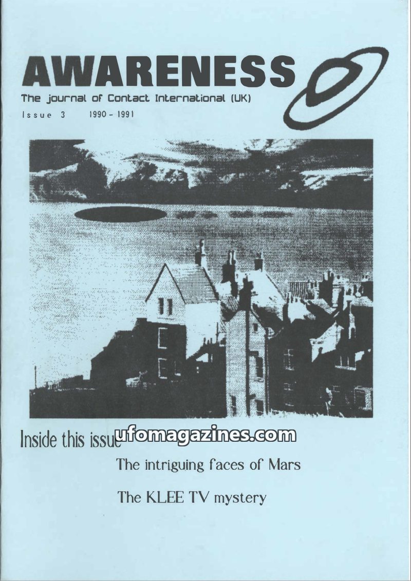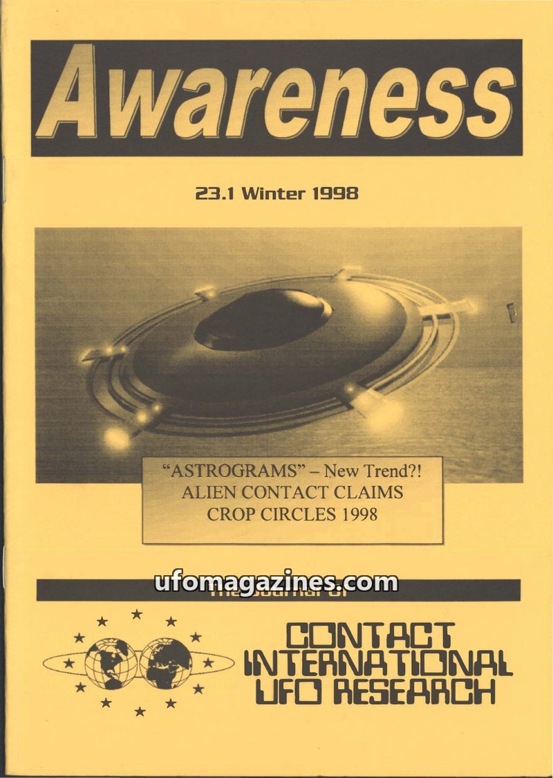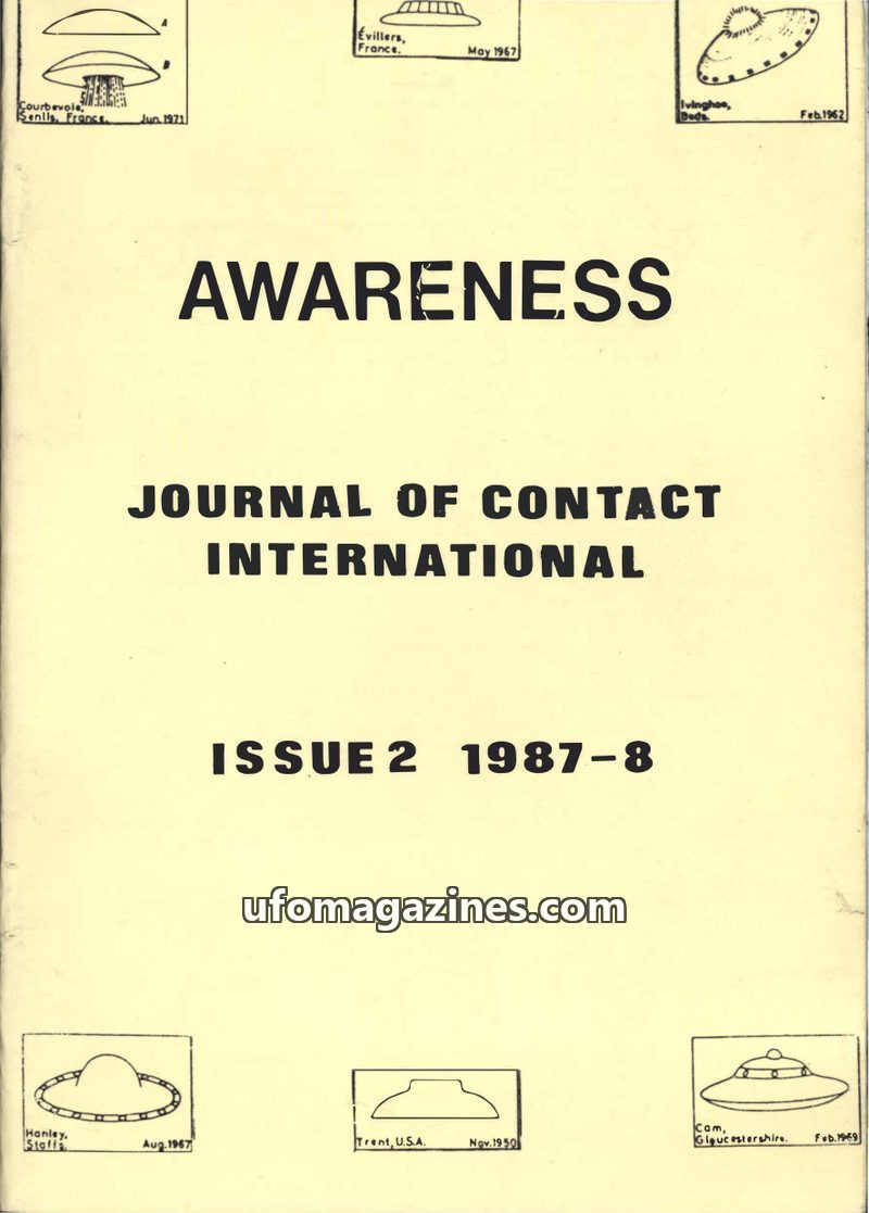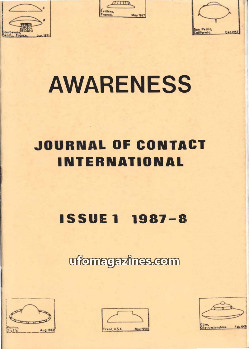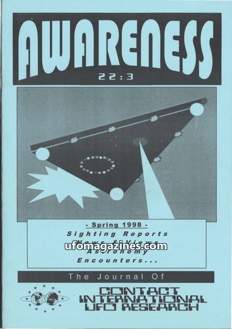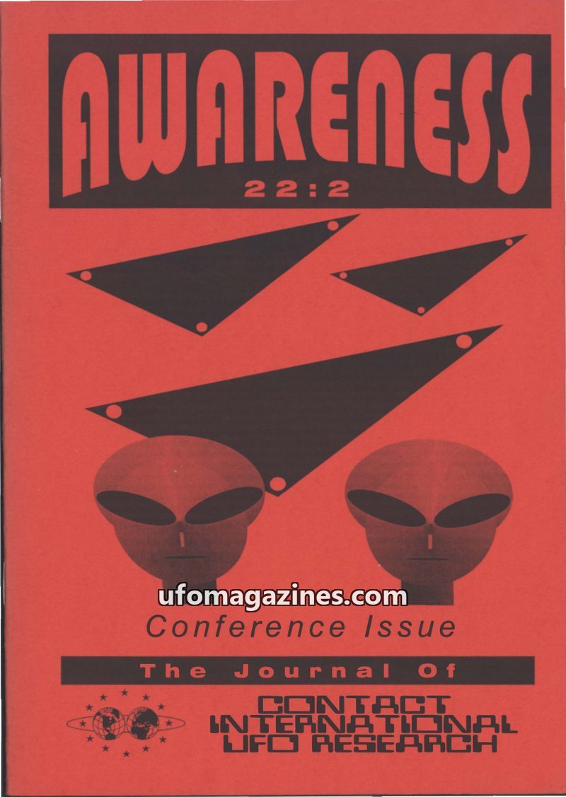 This issue of Awareness, the Journal of Contact International, covers a range of UFO-related topics. The editorial discusses a modest increase in subscription costs due to rising e