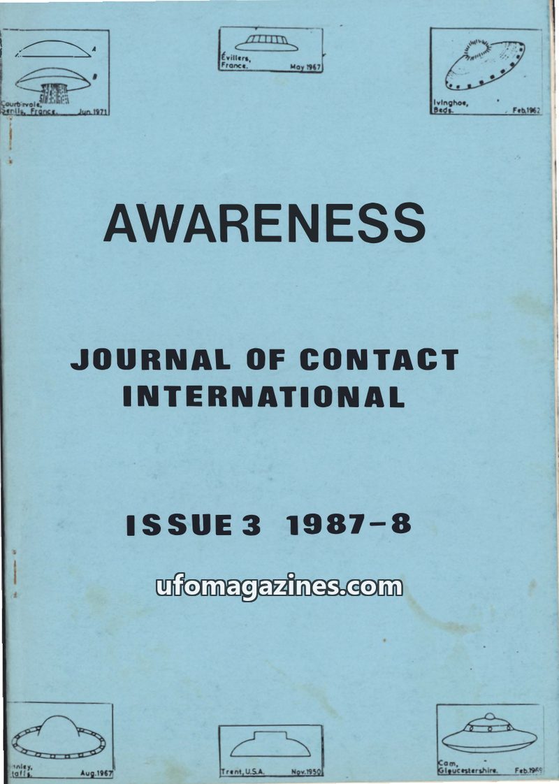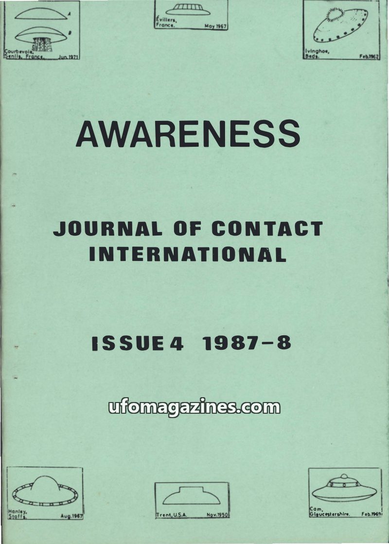 This issue of Awareness Journal of Contact International (Issue 4, 1987-8) focuses on UFO phenomena, including a historical catalog of sightings from 1900-1947 and a discussion on
