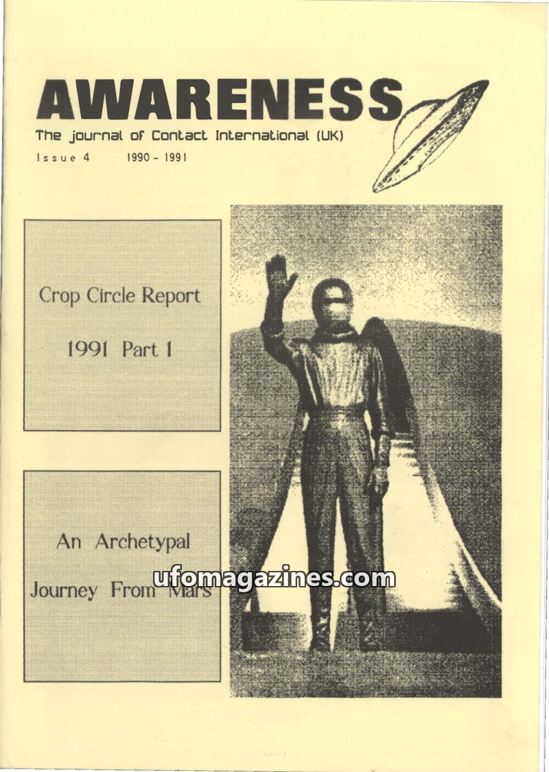 This issue of the Journal of Contact International focuses on 'Awareness' in 1990-1, highlighting the significant increase in crop circle formations and the ongoing debate about th
