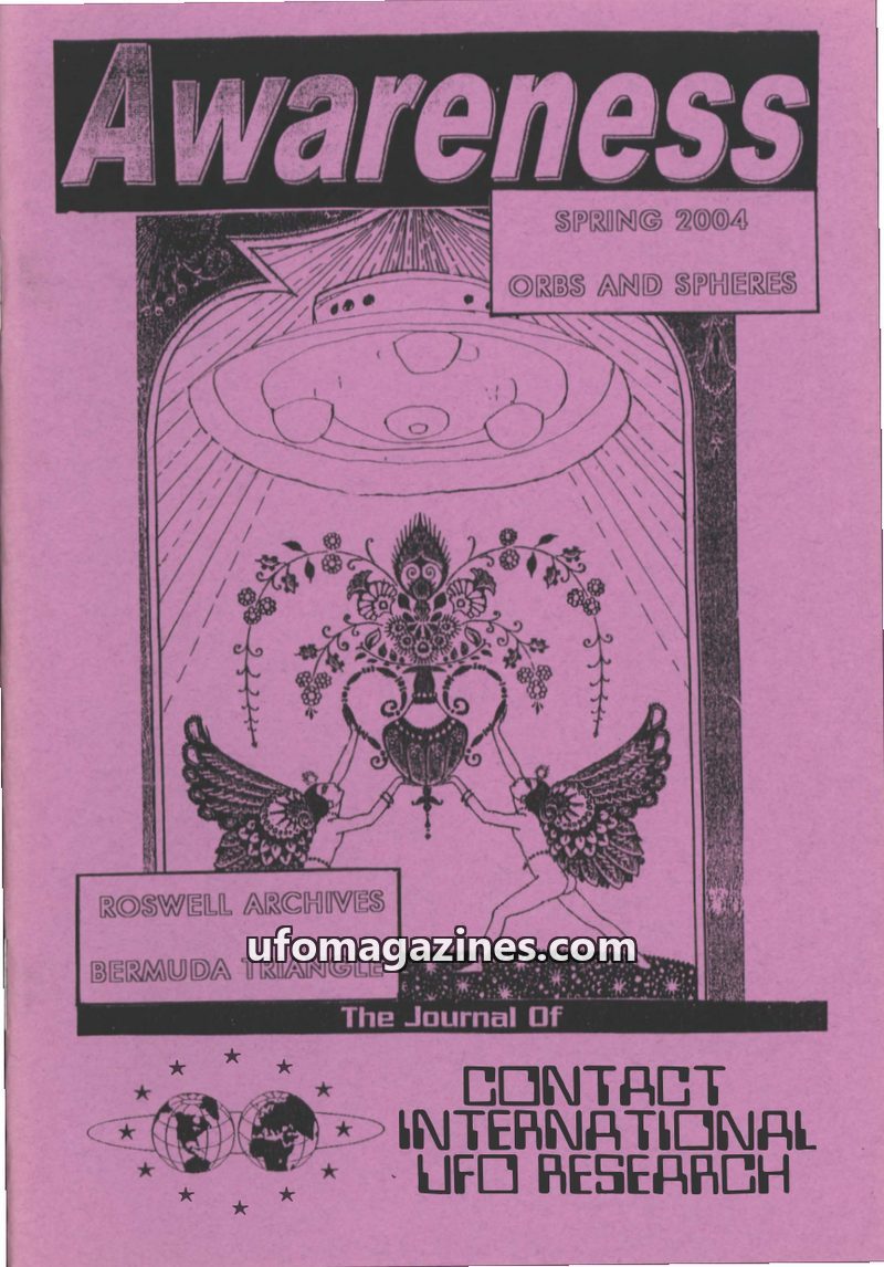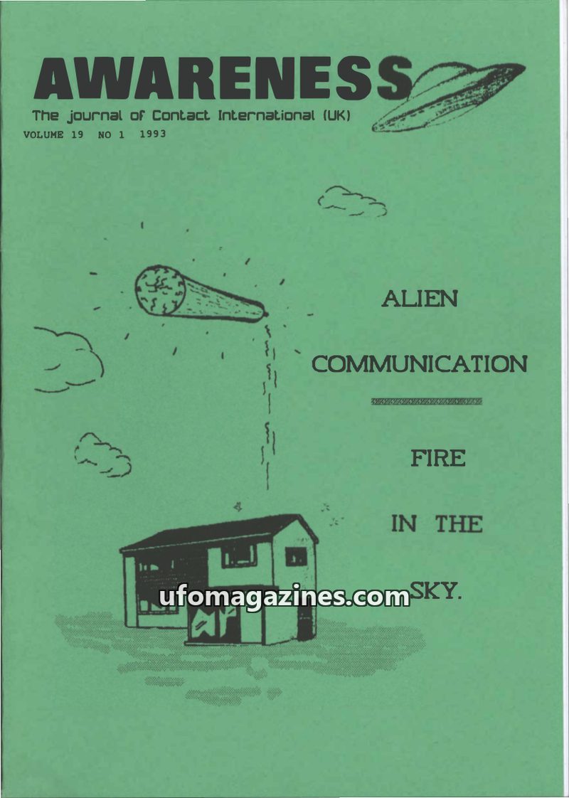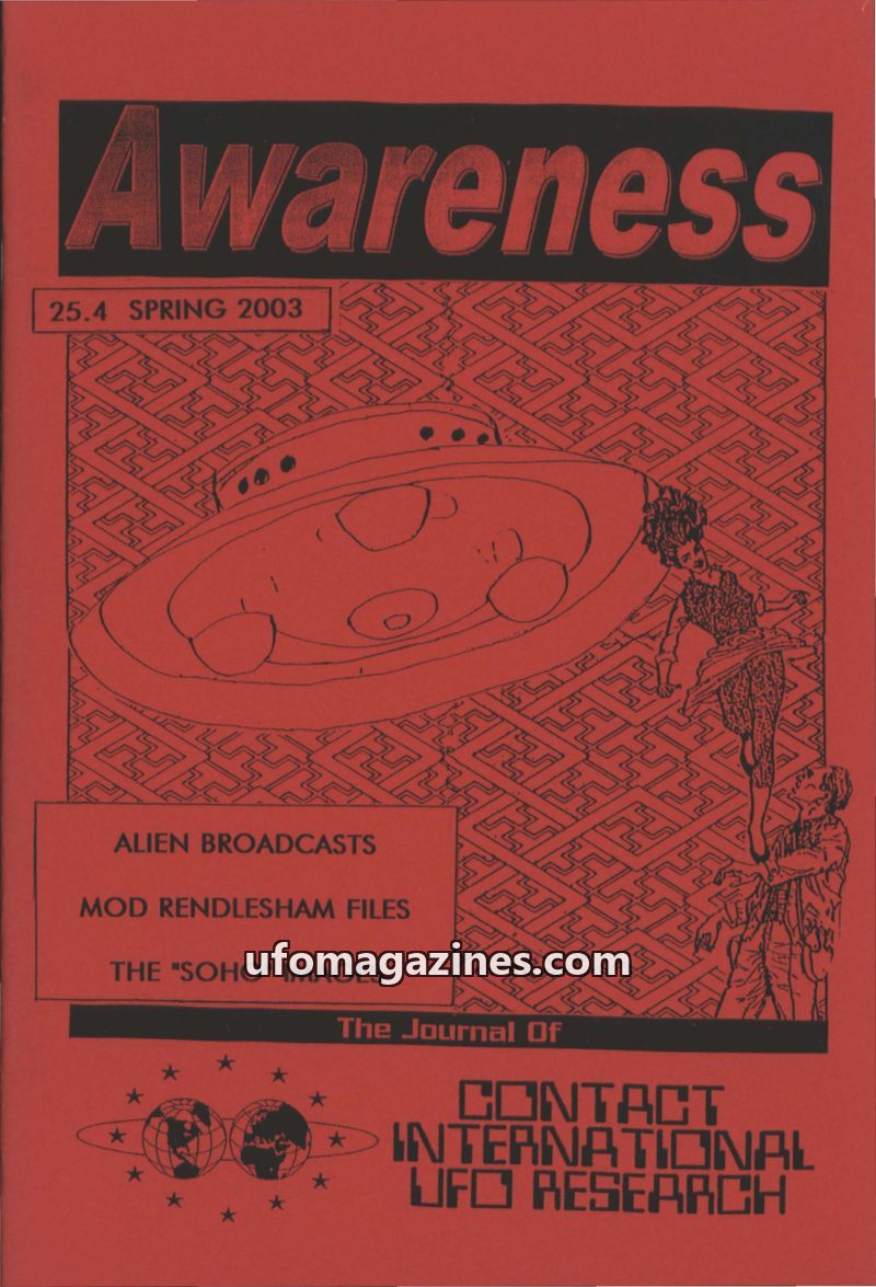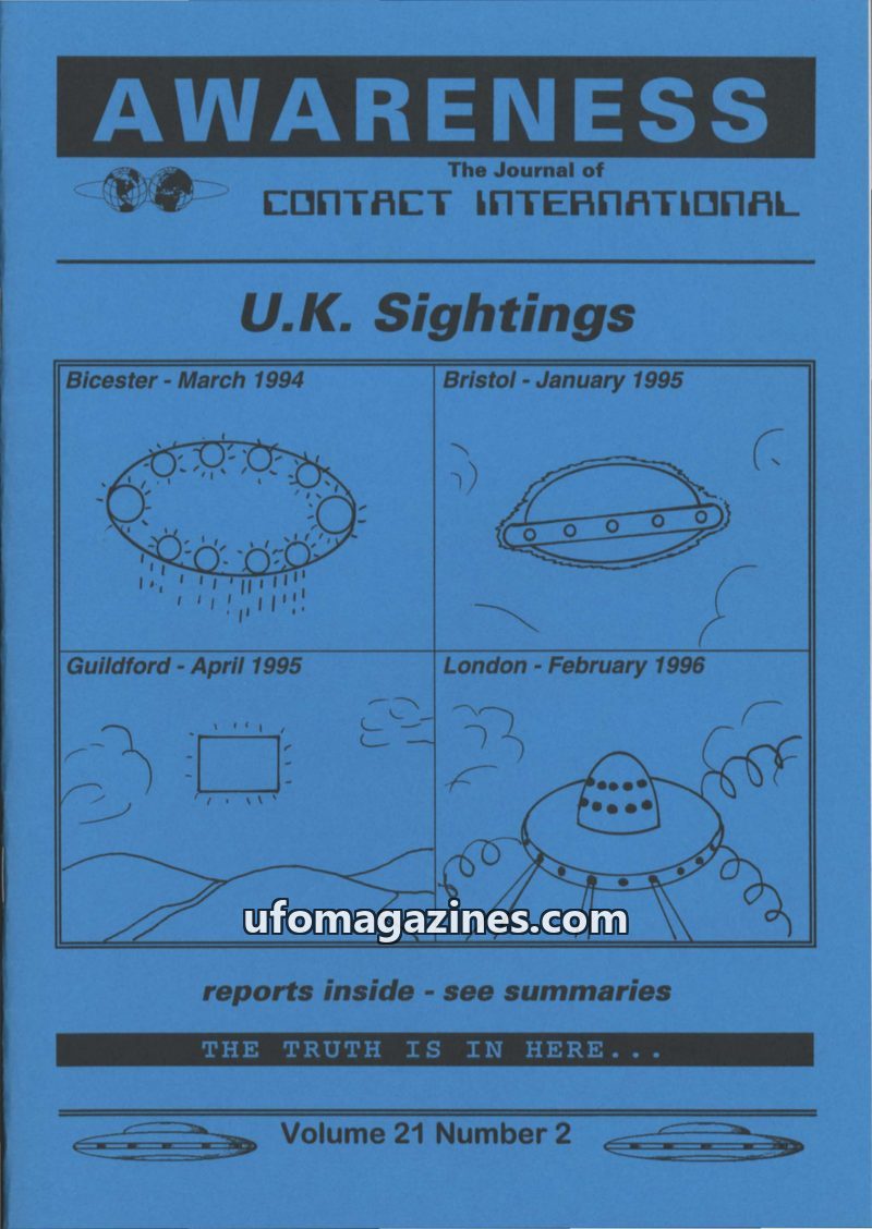 This issue of Awareness Journal of Contact International covers a range of UFO-related topics. An editorial highlights a recent increase in UFO reporting activity in the UK during