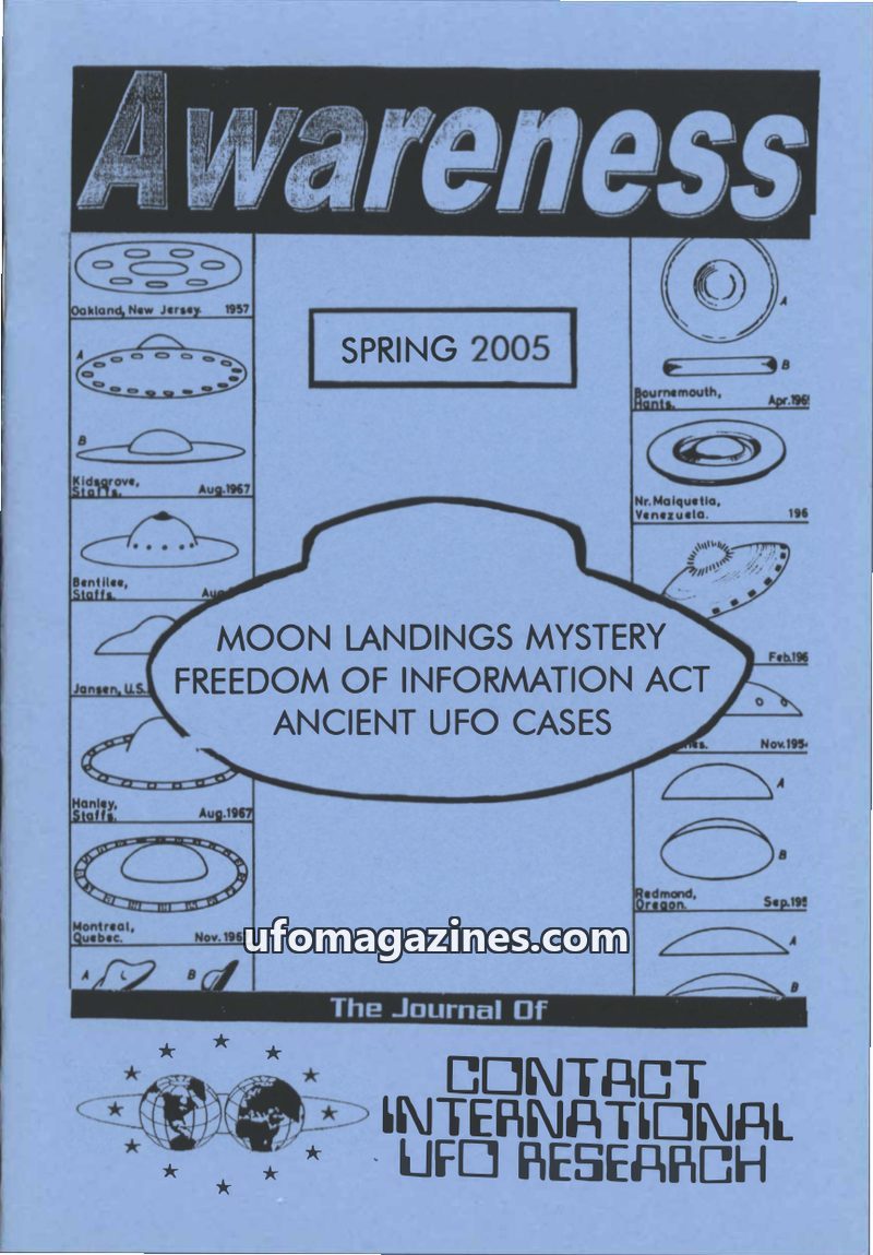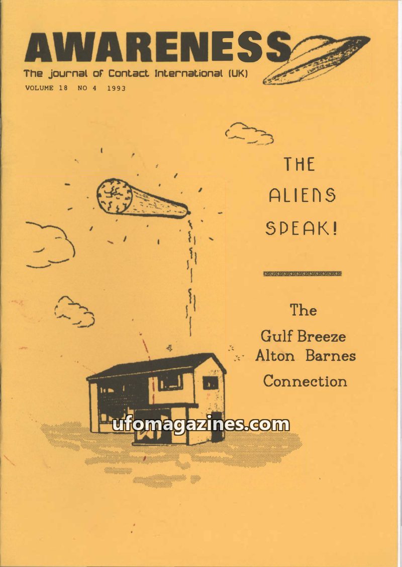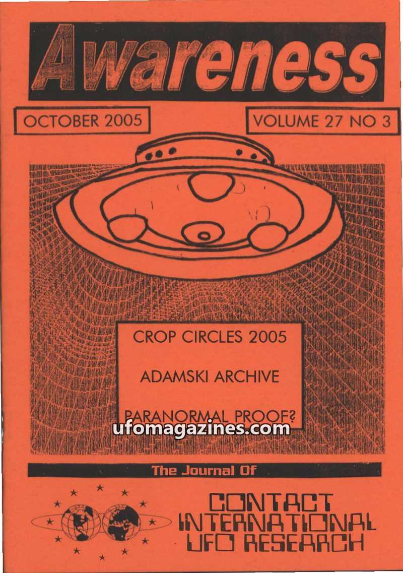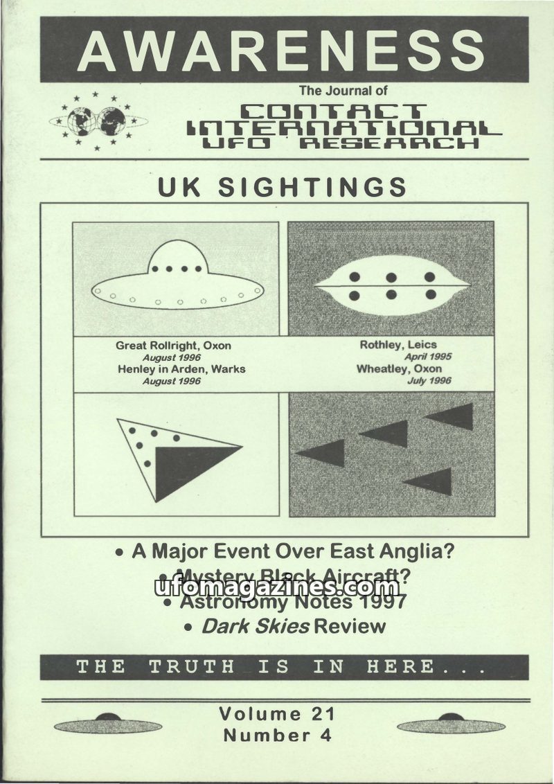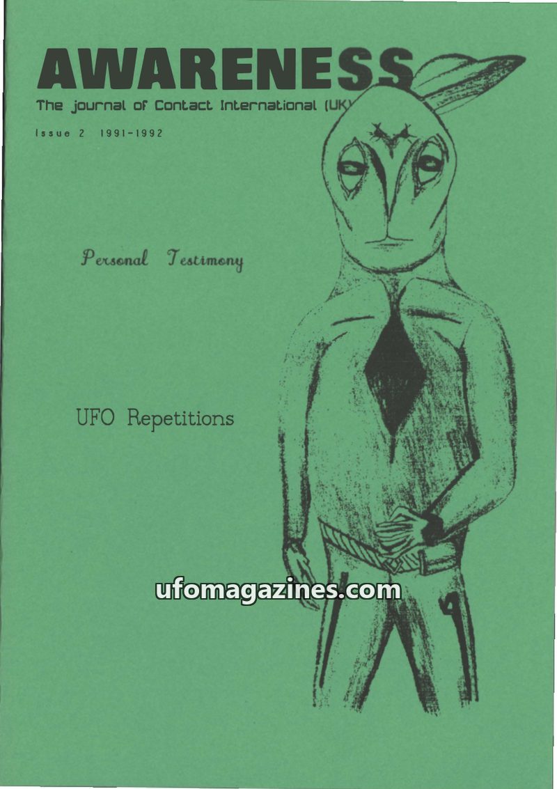 This issue of Awareness Journal of Contact International covers a range of UFO-related topics. An editorial highlights a recent increase in UFO reporting activity in the UK during