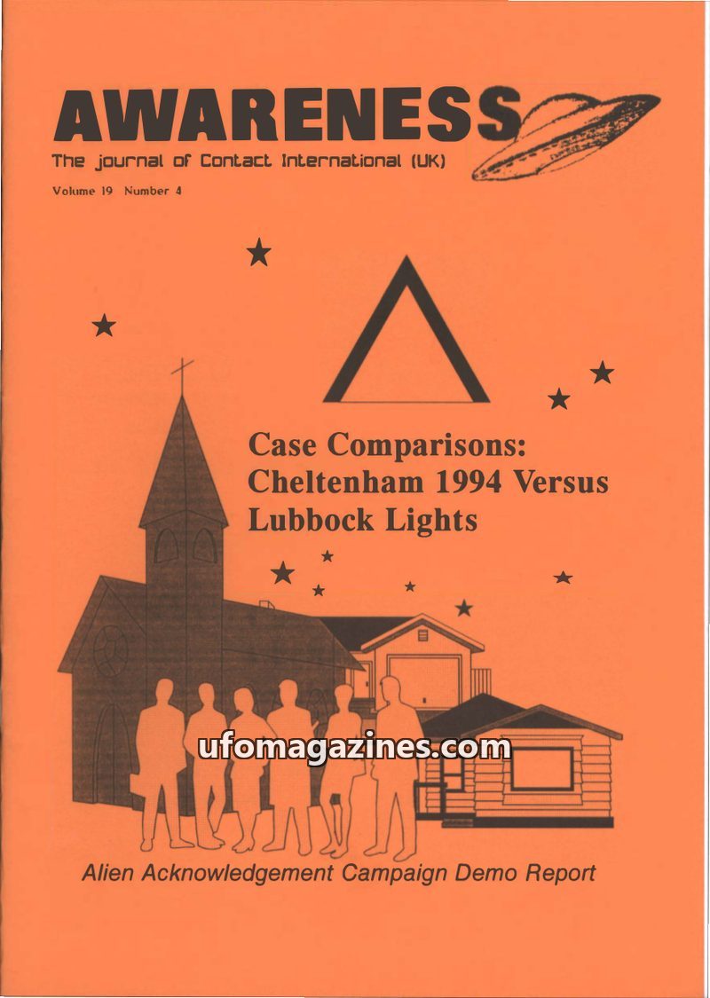 This issue of Awareness magazine compares the Cheltenham 1994 UFO sighting with the historical Lubbock Lights case, highlighting similarities in nocturnal processions. It also cove