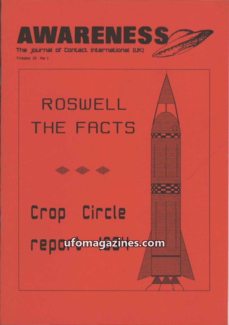 This issue of Awareness magazine delves into the Roswell Incident, presenting the official USAF investigation which concluded the recovered material was from a Project Mogul balloo