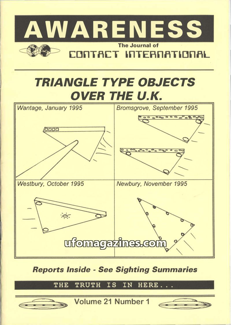 This issue of Awareness magazine, Volume 21 Number 1, focuses on 'Triangle Type Objects Over The U.K.' with reports from Wantage, Bromsgrove, Westbury, and Newbury in 1995. The jou
