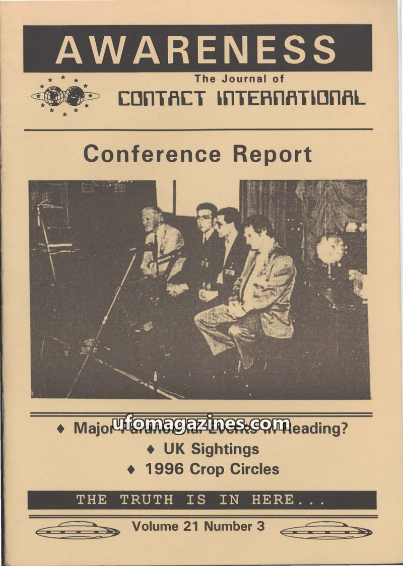 This issue of Awareness magazine, dated November 1996, focuses on the 'Conference Report' of Contact International. It covers presentations on UFOs in controlled airspace, local an