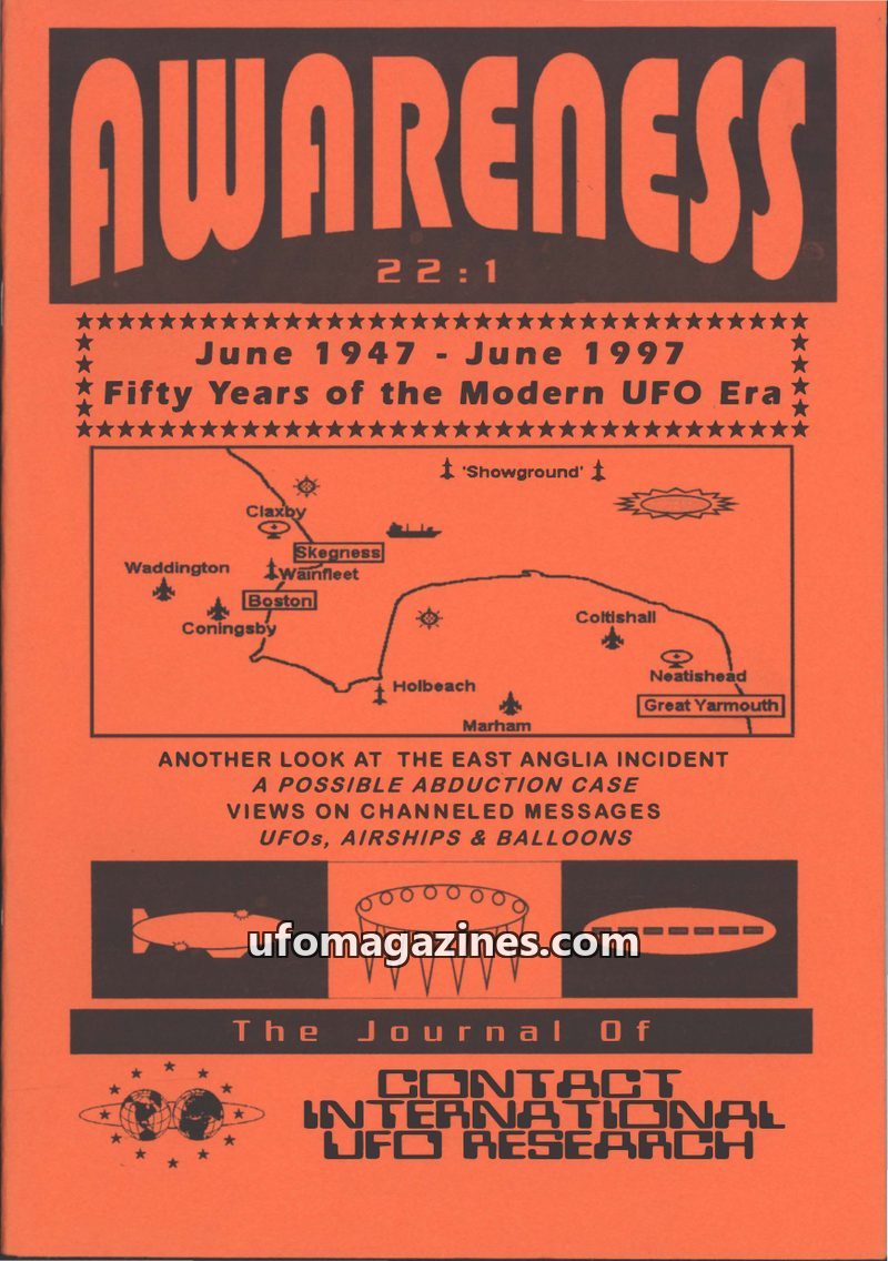 This issue of Awareness magazine celebrates 'Fifty Years of the Modern UFO Era' (June 1947 - June 1997). It includes a detailed look at the East Anglia Incident, a possible abducti