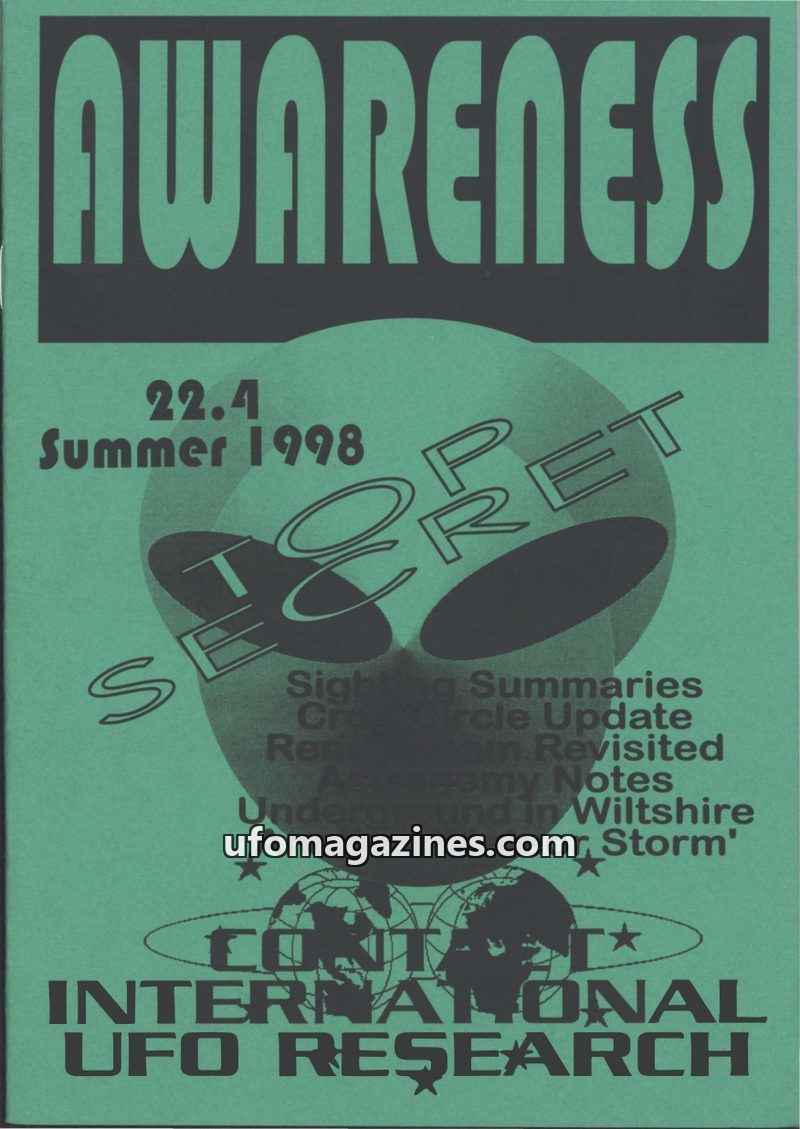 This issue of Awareness magazine, dated Spring 1998, covers a range of UFO-related topics. It includes a detailed investigation into the 1974 Berwyn Mountain incident in Wales, sug