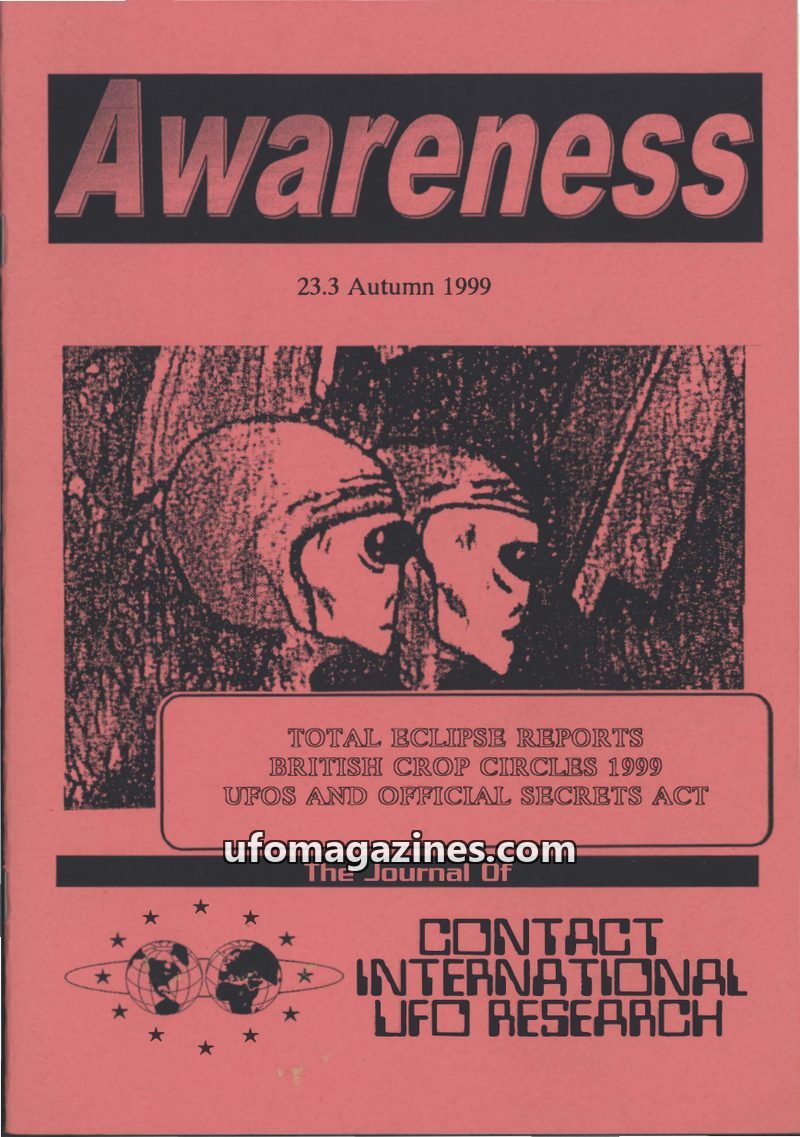 This issue of Awareness magazine, dated Autumn 1999, covers reports from the total solar eclipse of August 11th, 1999, detailing unusual atmospheric and light phenomena. It also fe