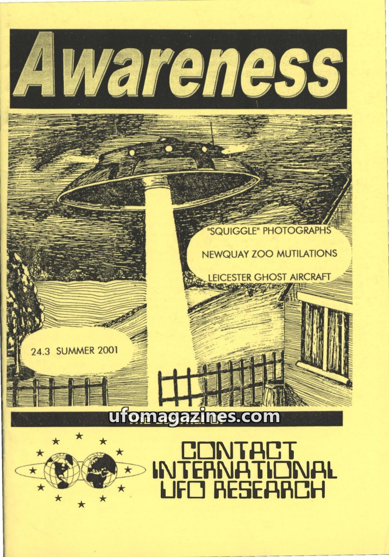 This issue of Awareness magazine, published Summer 2001, delves into various UFO phenomena. It features an investigation into a Leicestershire mystery involving a security officer'