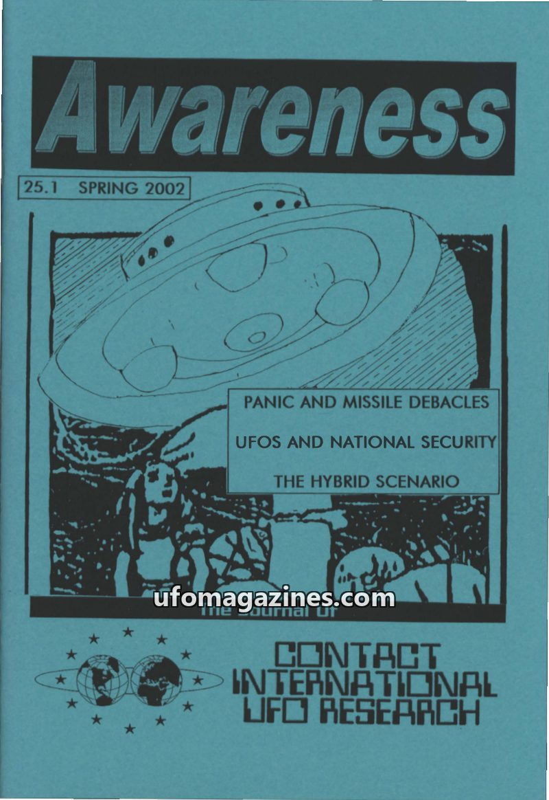 This issue of Awareness magazine from Spring 2002 delves into the evolving government UFO policy, the potential national security implications of UFOs, and explores the 'Hybrid Sce