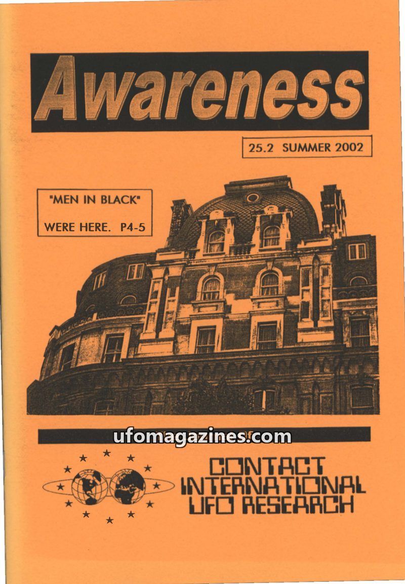 This issue of Awareness magazine from Summer 2002 delves into various UFO-related topics. It discusses the identification of Britain's 'Man in Black' from the 1950s, the ongoing ph