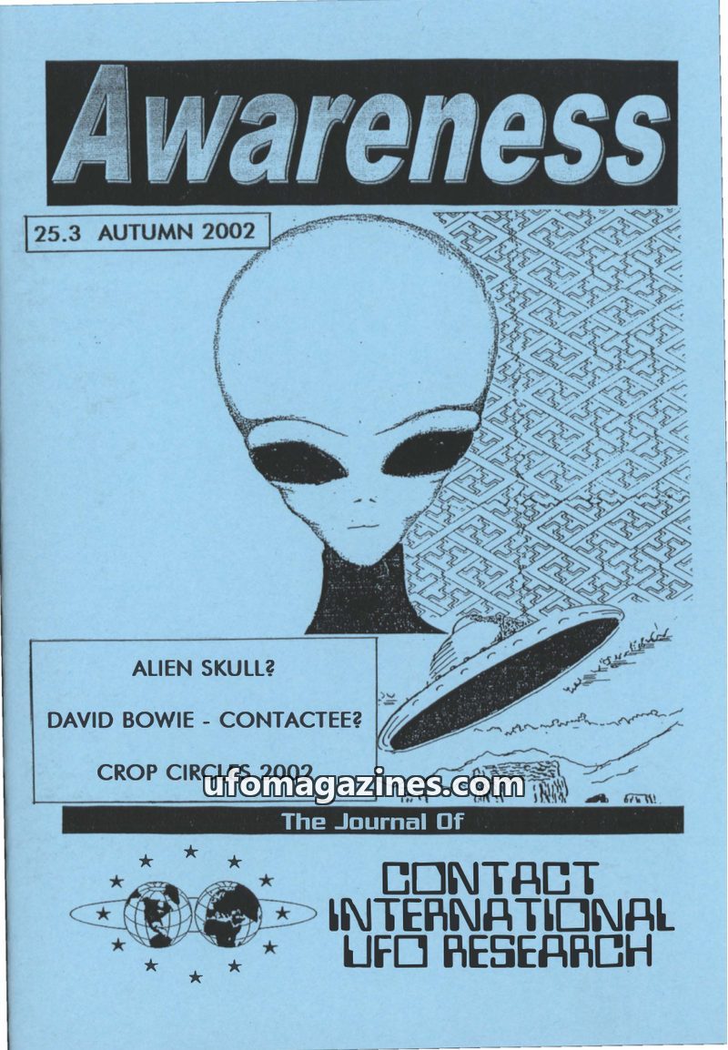 This issue of Awareness magazine, dated Autumn 2002, delves into various UFO and paranormal topics. It features articles on a potential alien skull discovery, David Bowie's alleged