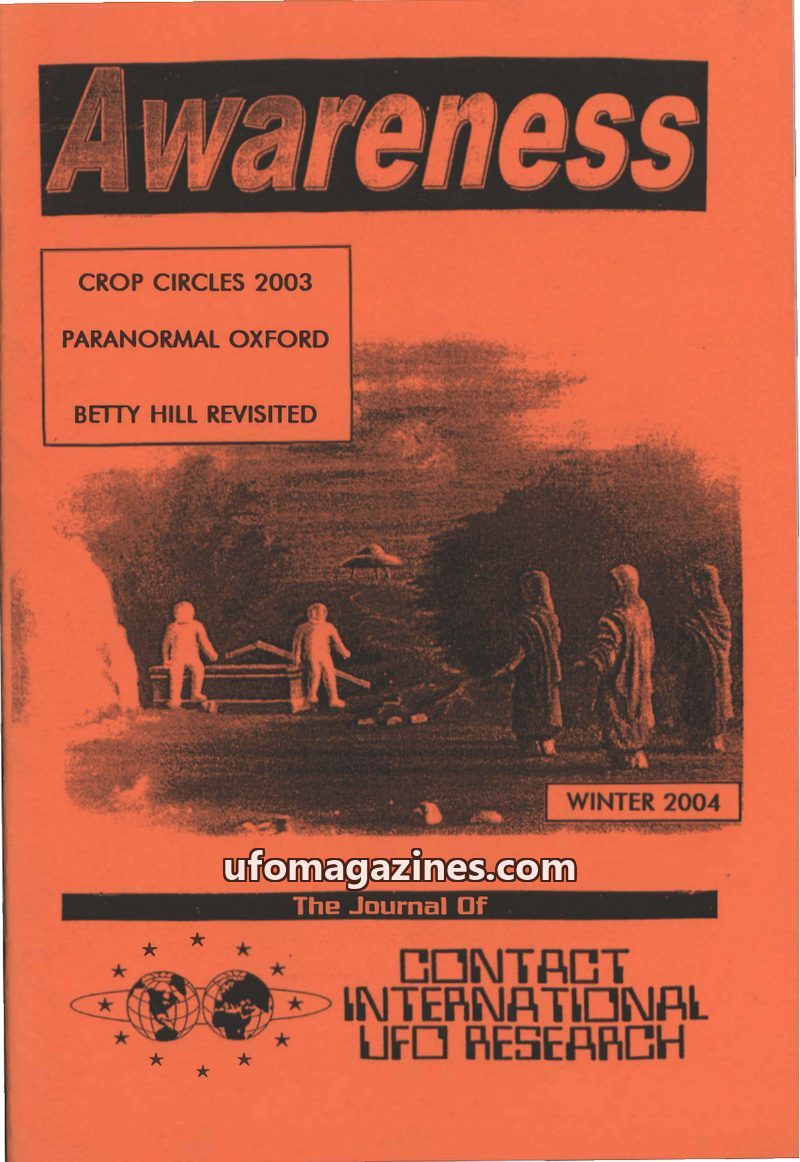 This issue of Awareness magazine, dated Winter 2004, features articles on Crop Circles 2003, Paranormal Oxford, and a revisit to the Betty Hill case. The editorial mourns the passi