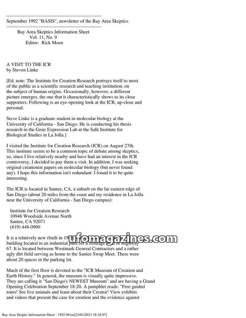 This article reviews a visit to the Institute for Creation Research (ICR) museum in Santee, CA, by Steven Linke. The museum presents exhibits that support a creationist view of ori