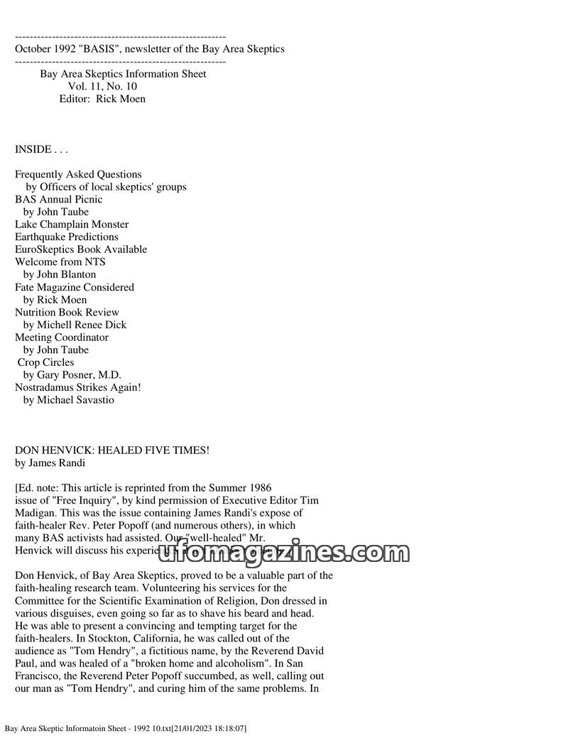This issue of 'BASIS' details Don Henvick's undercover work investigating faith healers like Peter Popoff, exposing their methods. It also covers a reported UFO sighting in Califor
