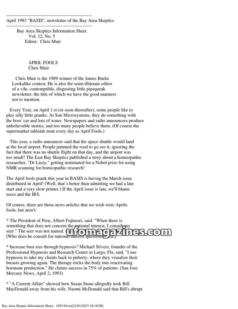 This issue of BASIS, the Bay Area Skeptics newsletter from April 1993, highlights the April Fools' prank of distributing the March issue late. It also debunks various claims, inclu