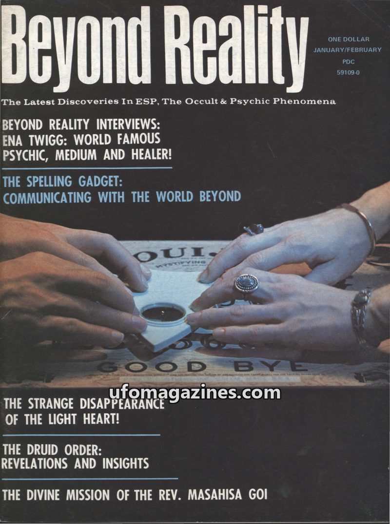 This issue of Beyond Reality magazine delves into psychic phenomena, the occult, and unexplained mysteries. It features an interview with psychic Ena Twigg, an exploration of biorh