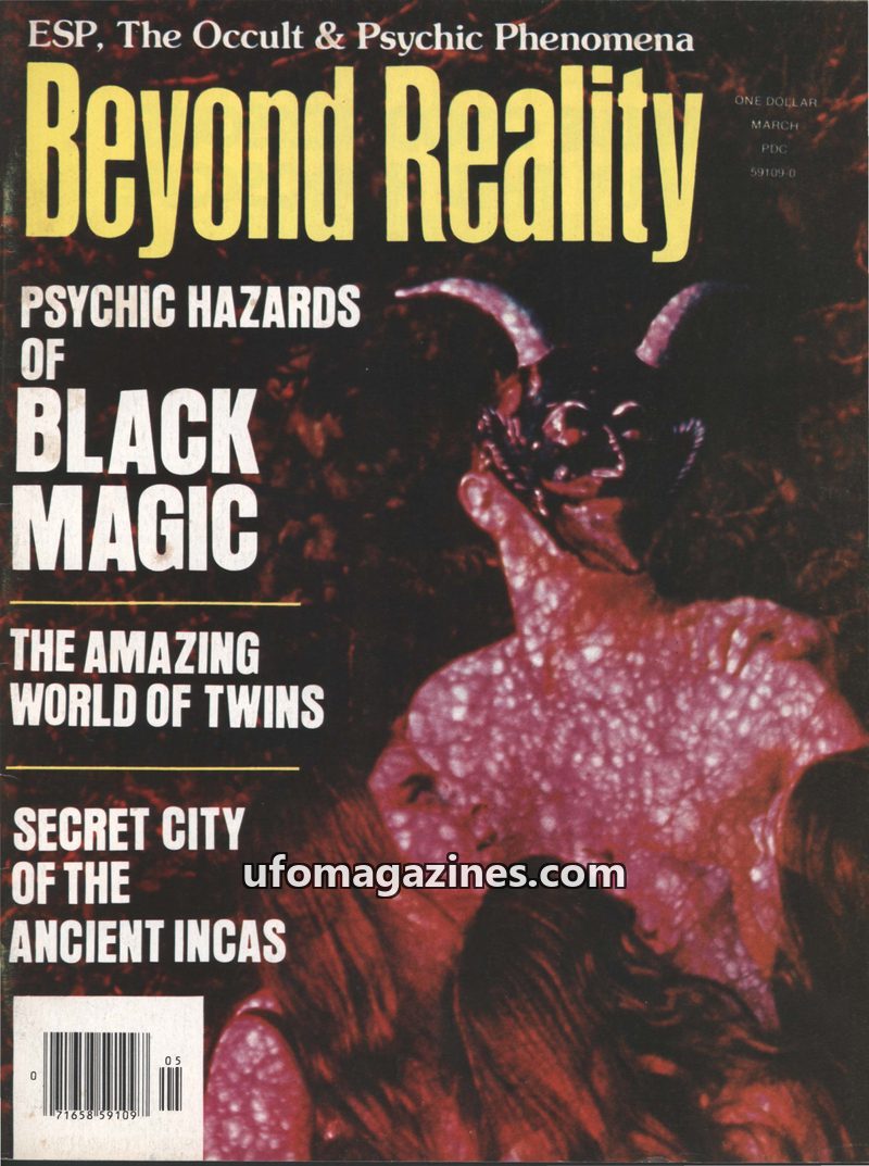 This issue of Beyond Reality magazine, dated March/April 1976, covers a range of paranormal and occult topics. Featured articles include 'Psychic Hazards of Black Magic,' 'The Amaz