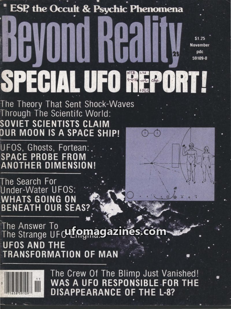 This issue of Beyond Reality focuses heavily on UFO phenomena, with a special report covering various aspects of the enigma. Articles explore the theory that the moon is a spaceshi