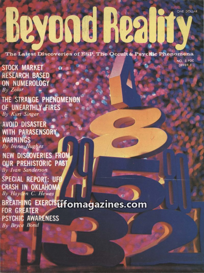 This issue of Beyond Reality magazine, dated August 1973, focuses on ESP, the occult, and psychic phenomena. Cover stories include numerology and the stock market, unearthly fires,