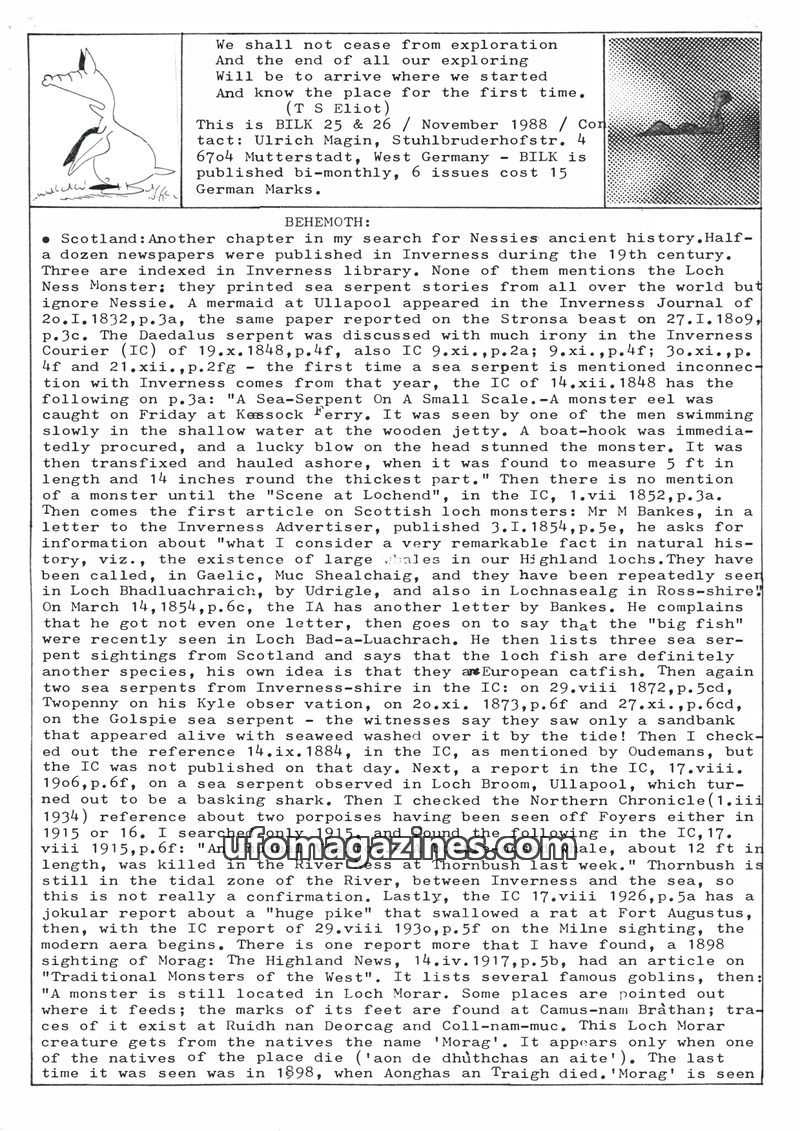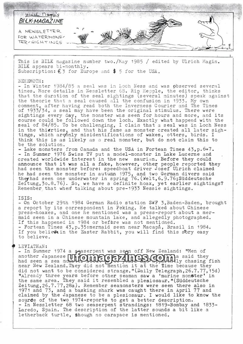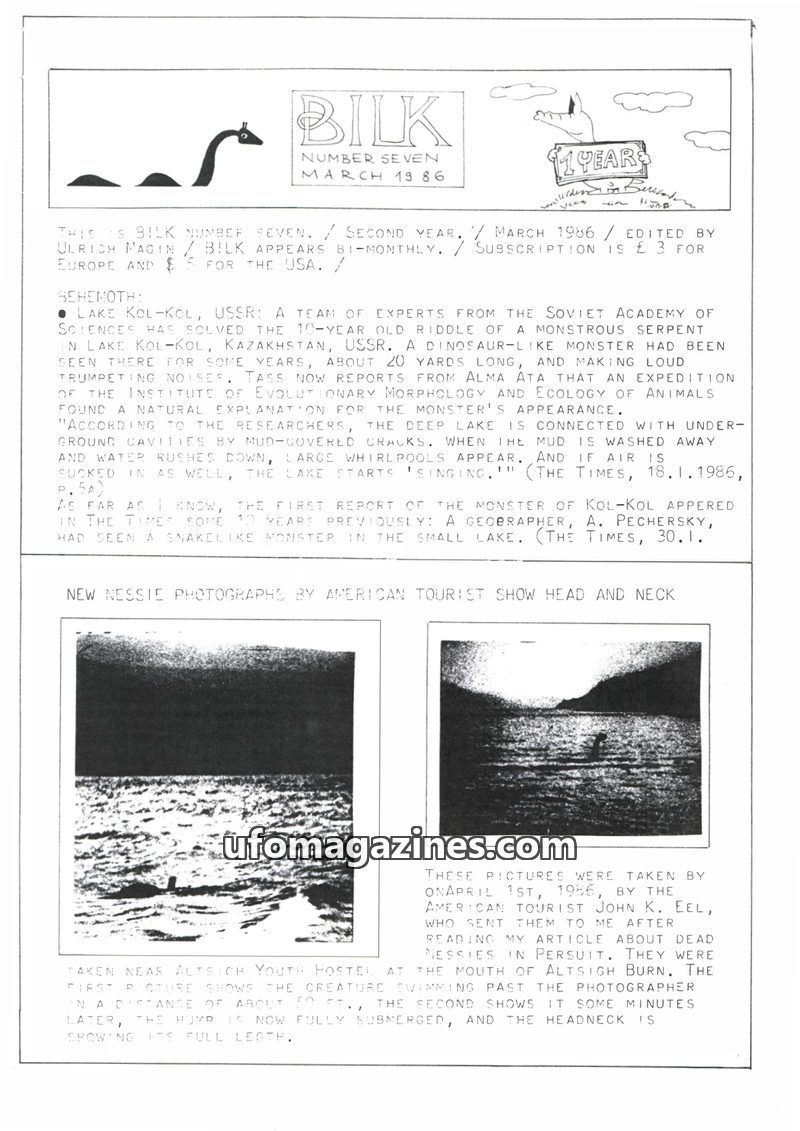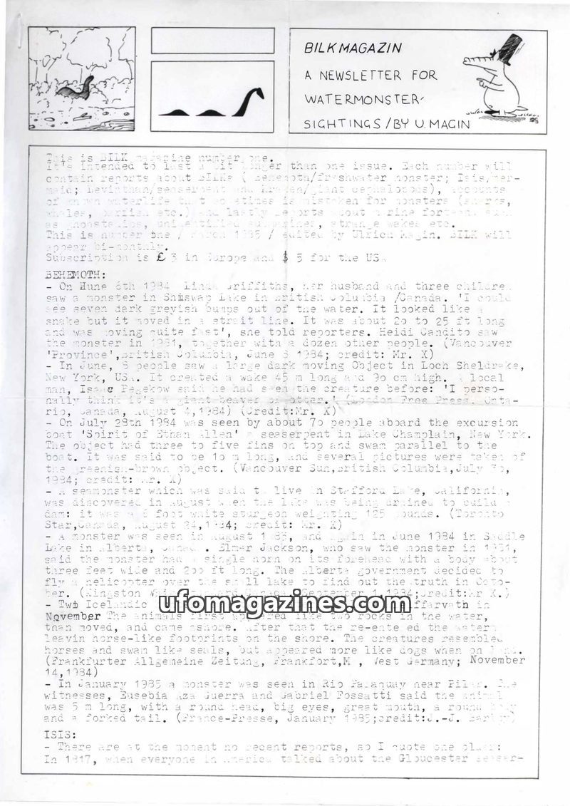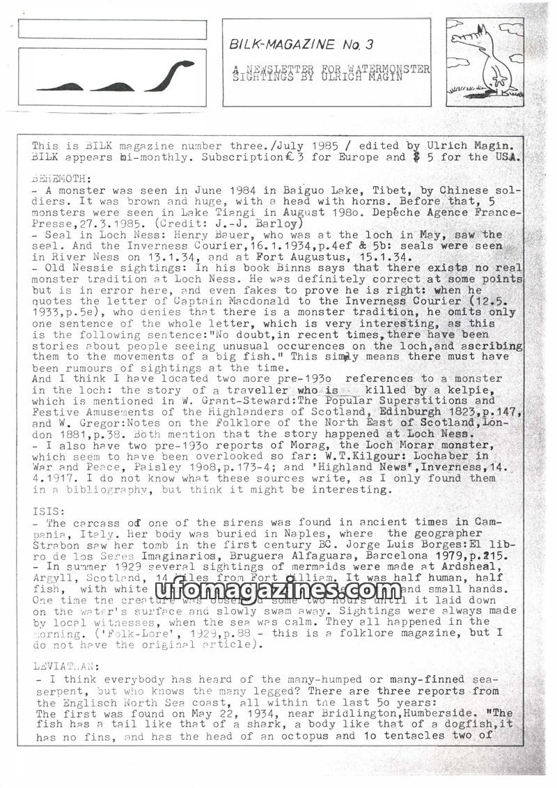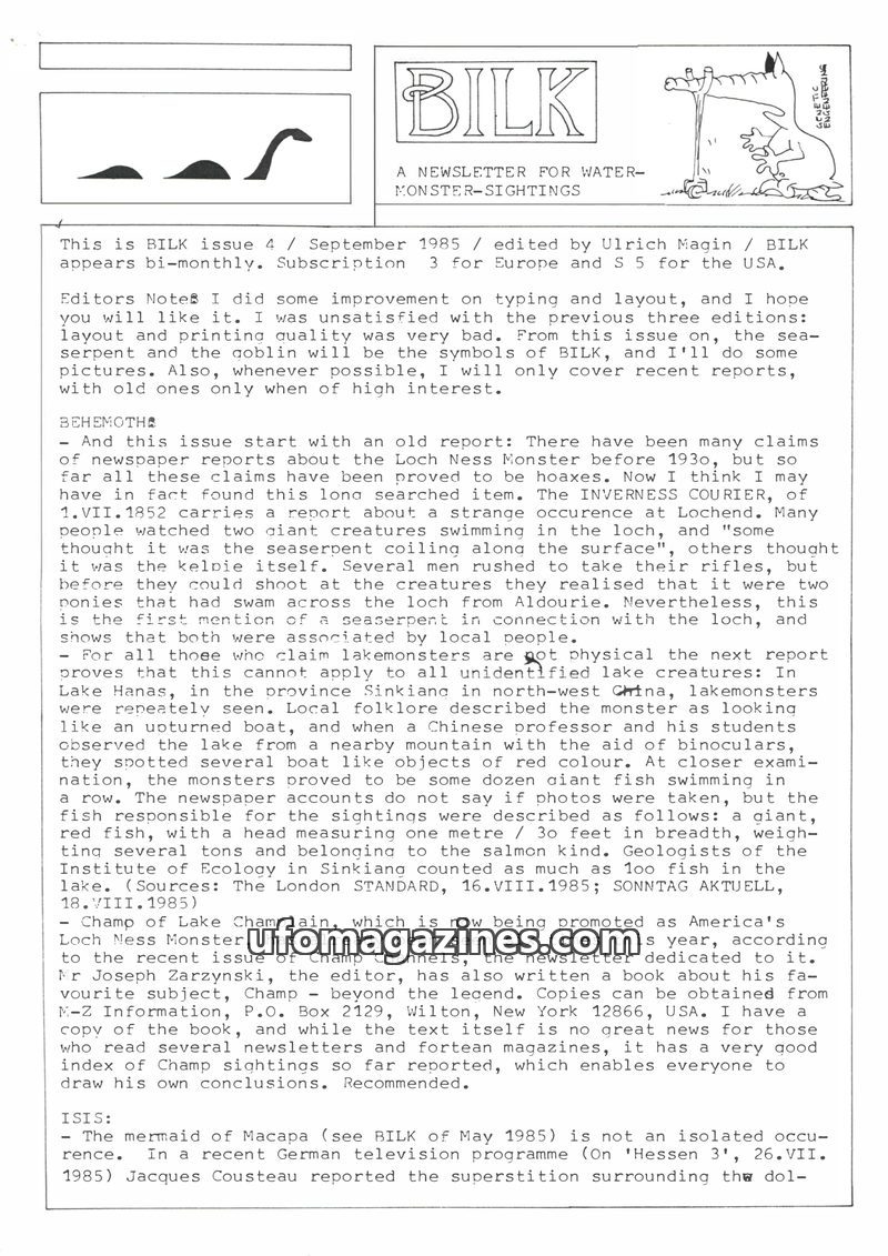 This issue of Bilk Magazine, edited by Ulrich Magin, focuses on water monster sightings and related phenomena. It details reports of a 'Behemoth' in Tibet, Loch Ness and Loch Morar