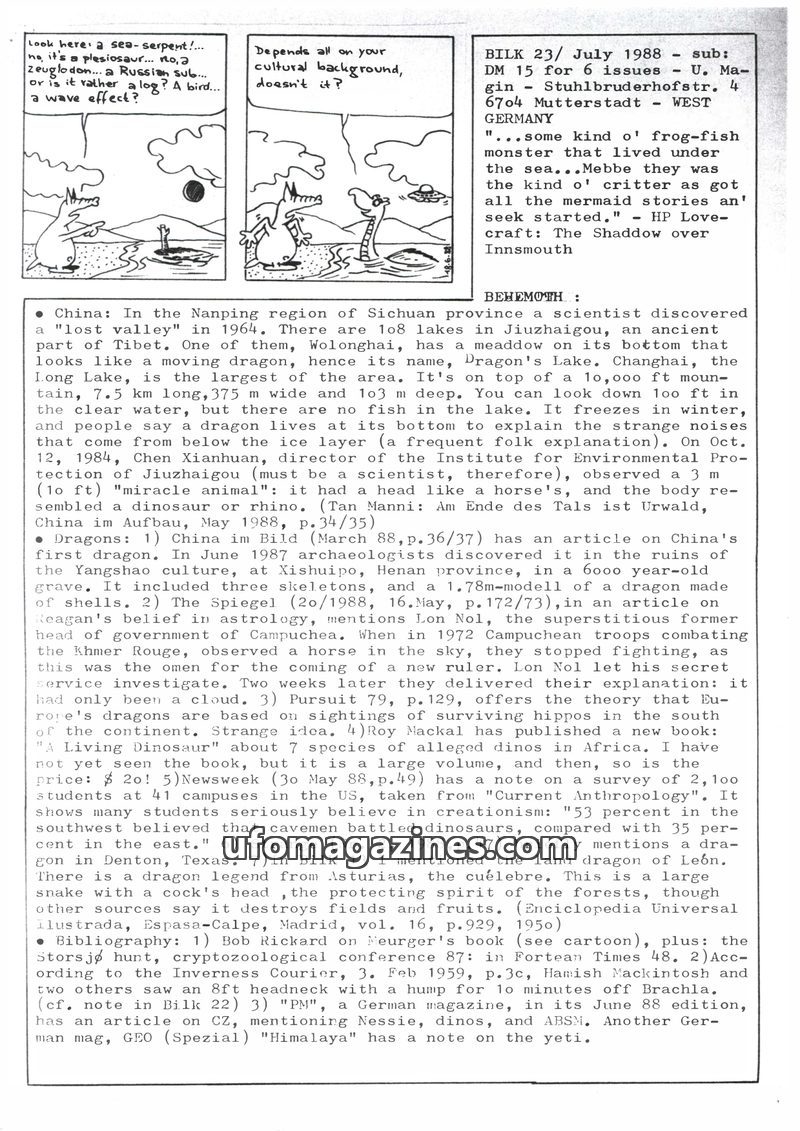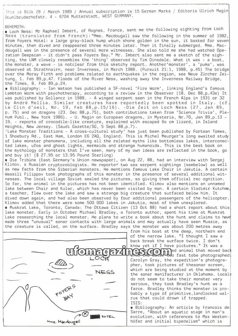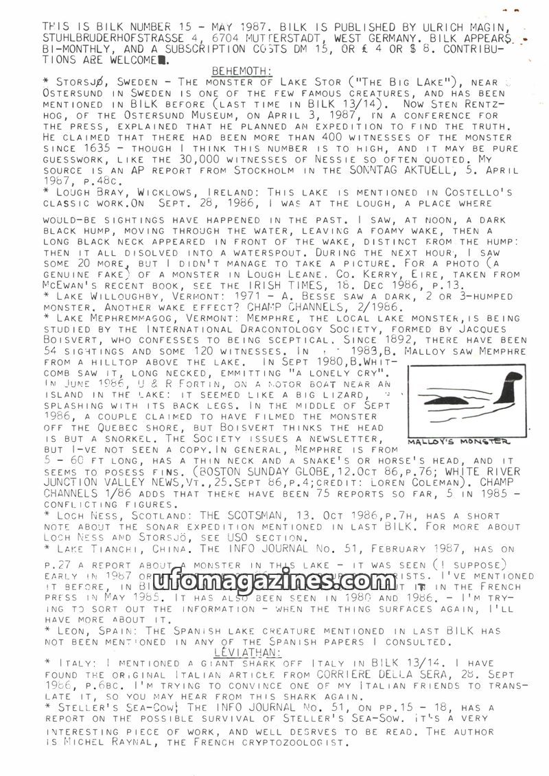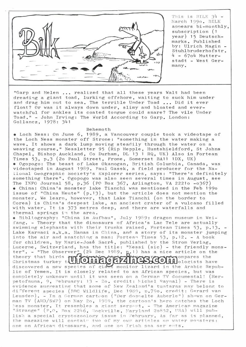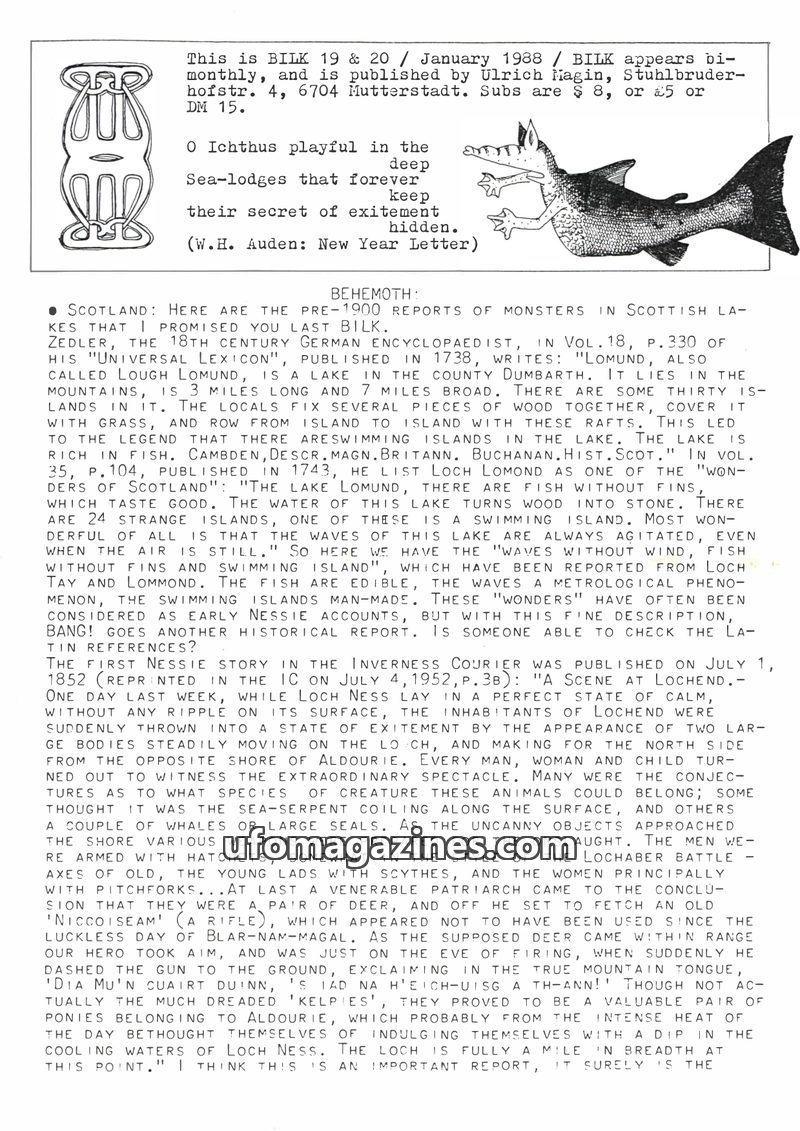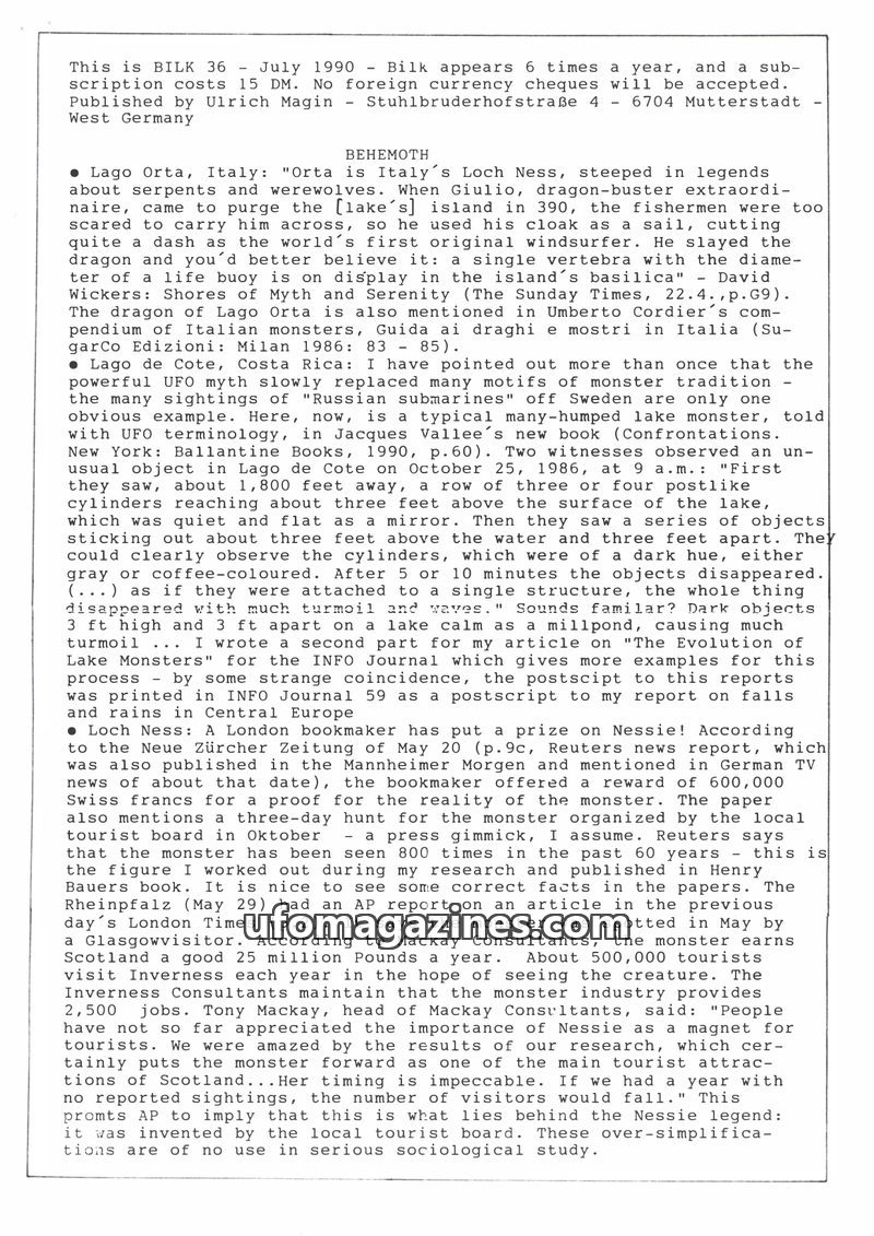 This issue of Bilk Magazine, edited by Ulrich Magin, focuses on water monster sightings and related phenomena. It details reports of a 'Behemoth' in Tibet, Loch Ness and Loch Morar