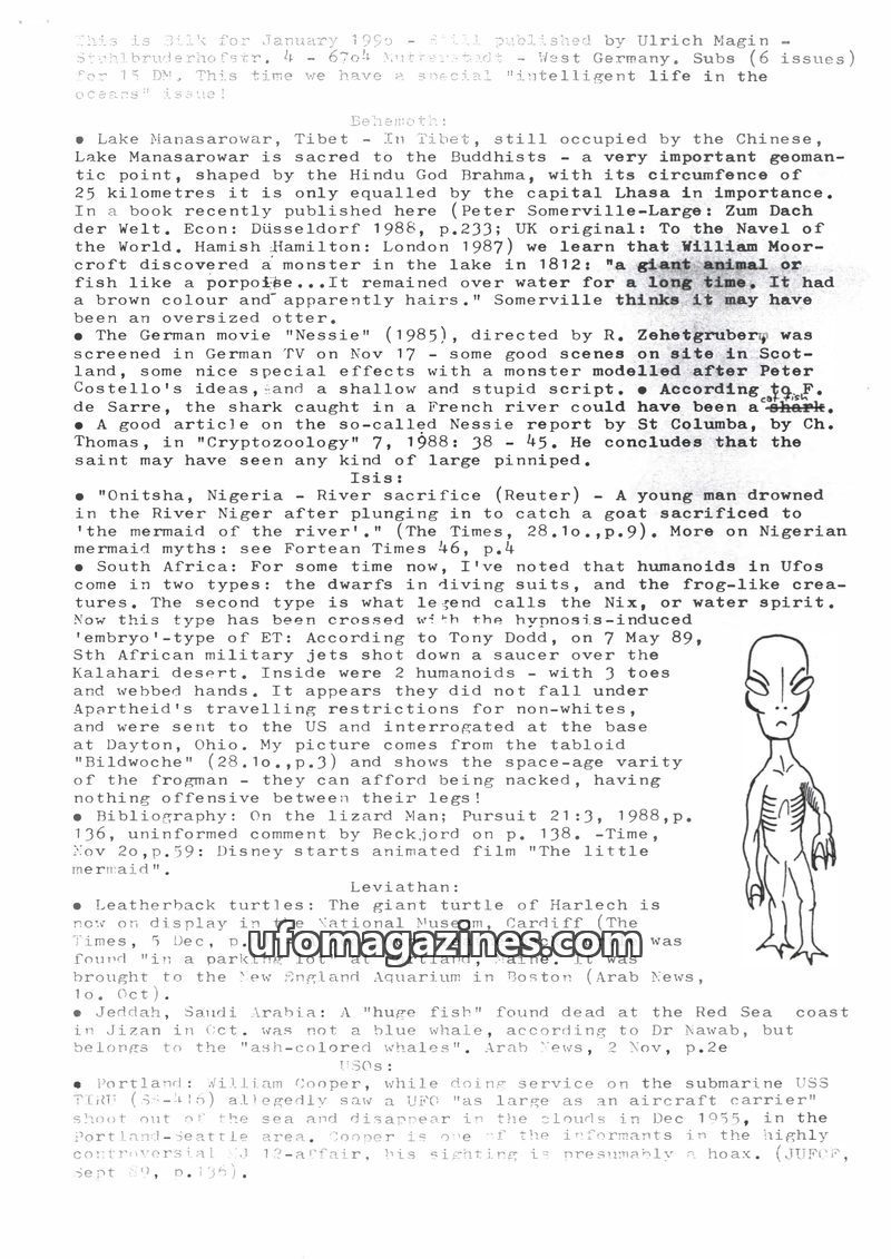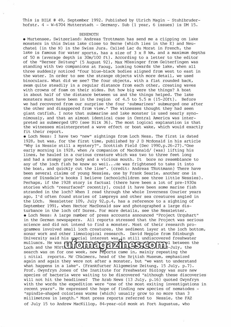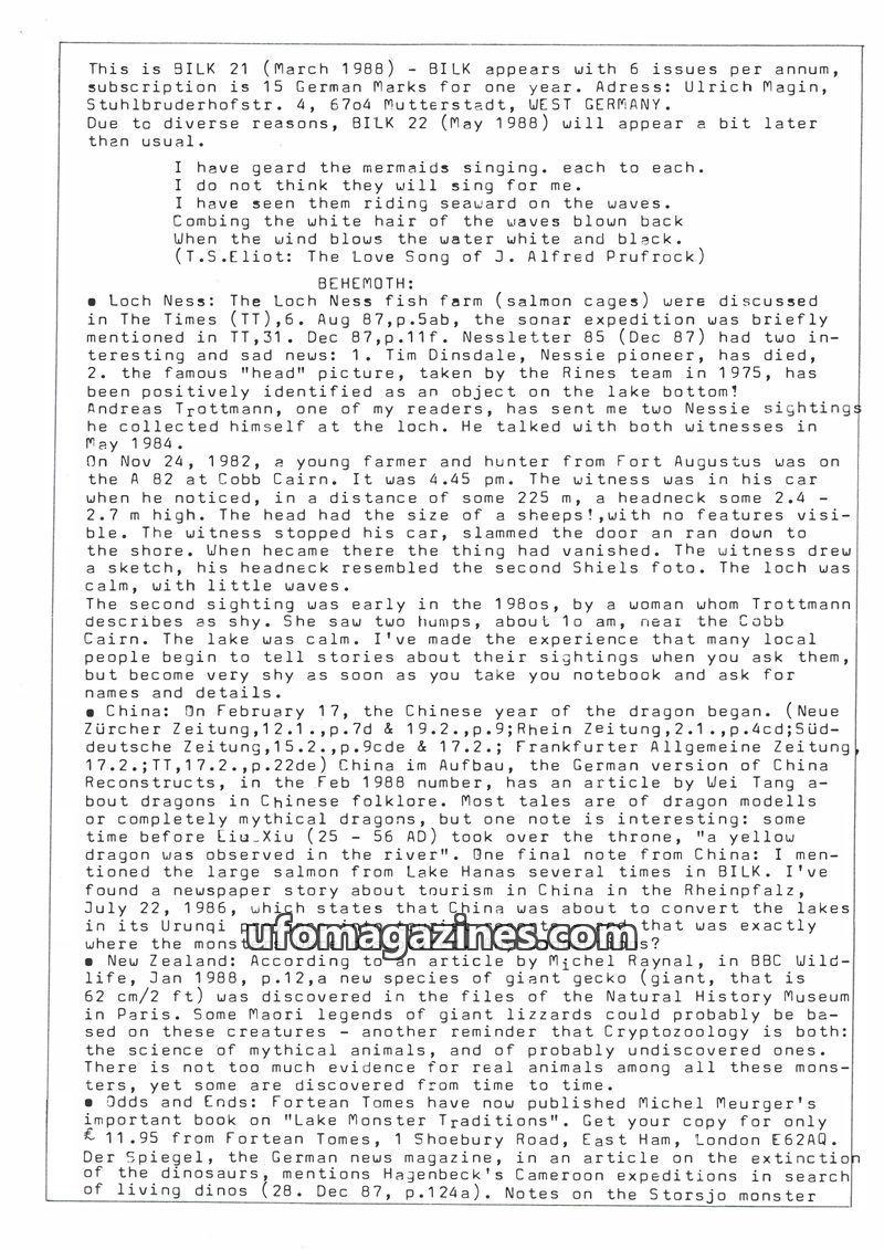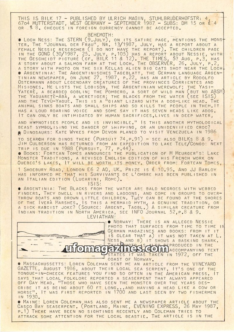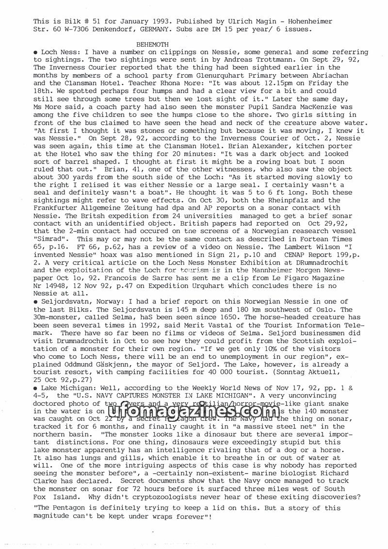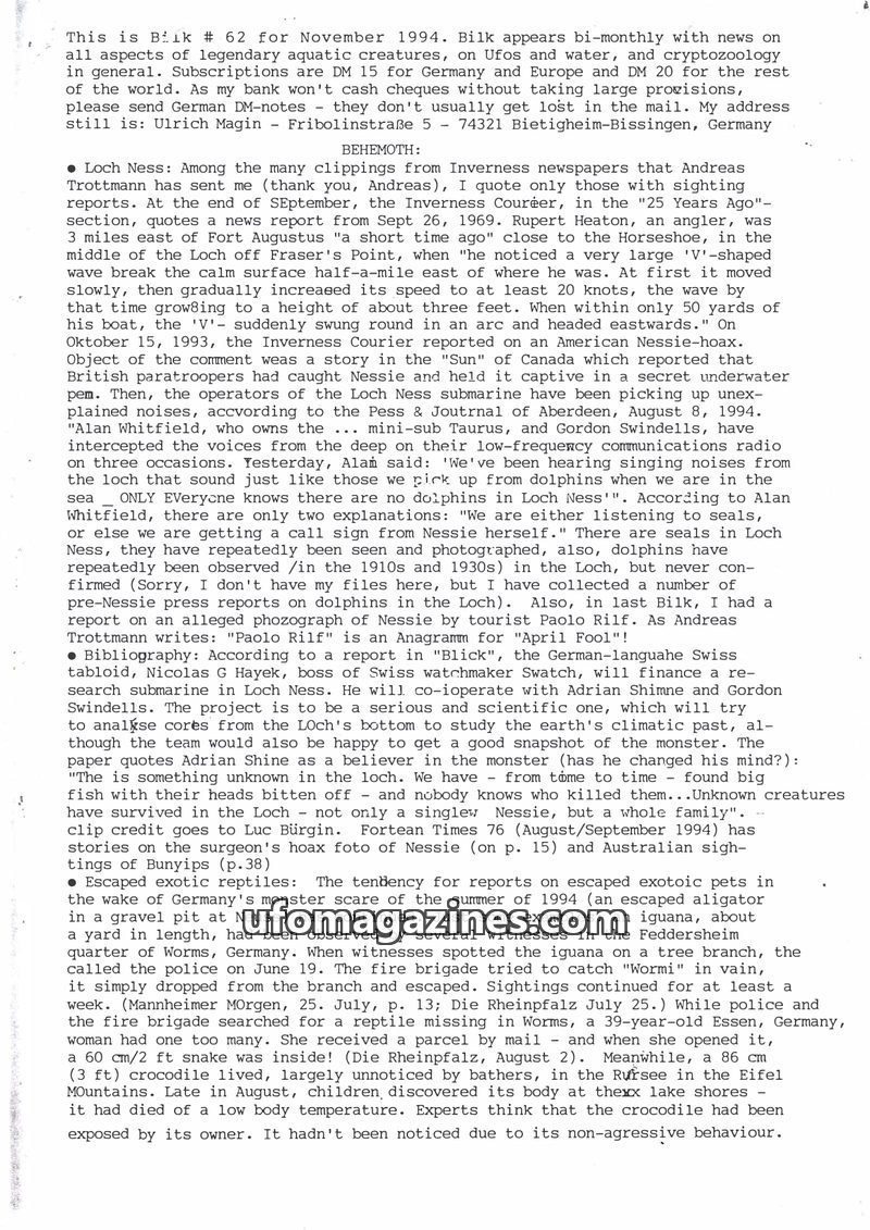 This issue of Bilk Magazine, edited by Ulrich Magin, focuses on water monster sightings and related phenomena. It details reports of a 'Behemoth' in Tibet, Loch Ness and Loch Morar