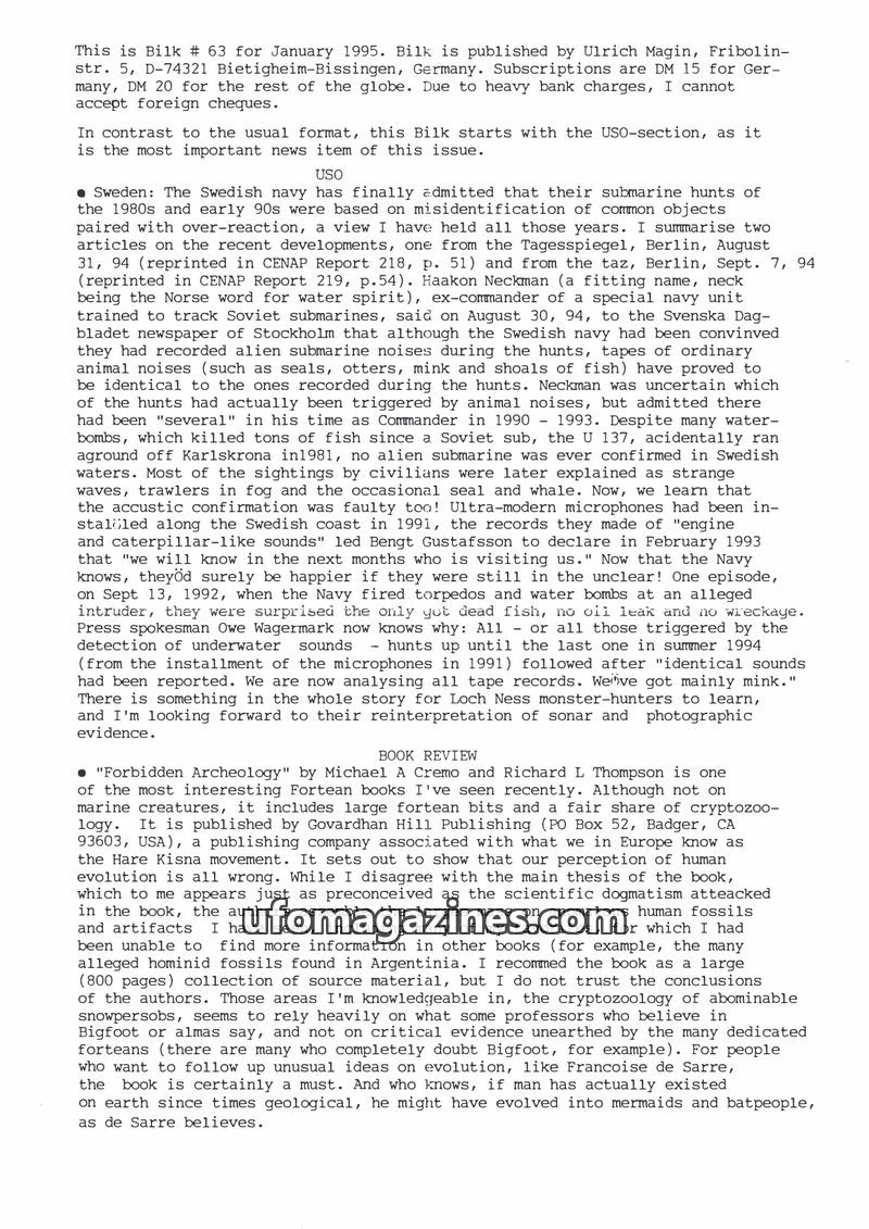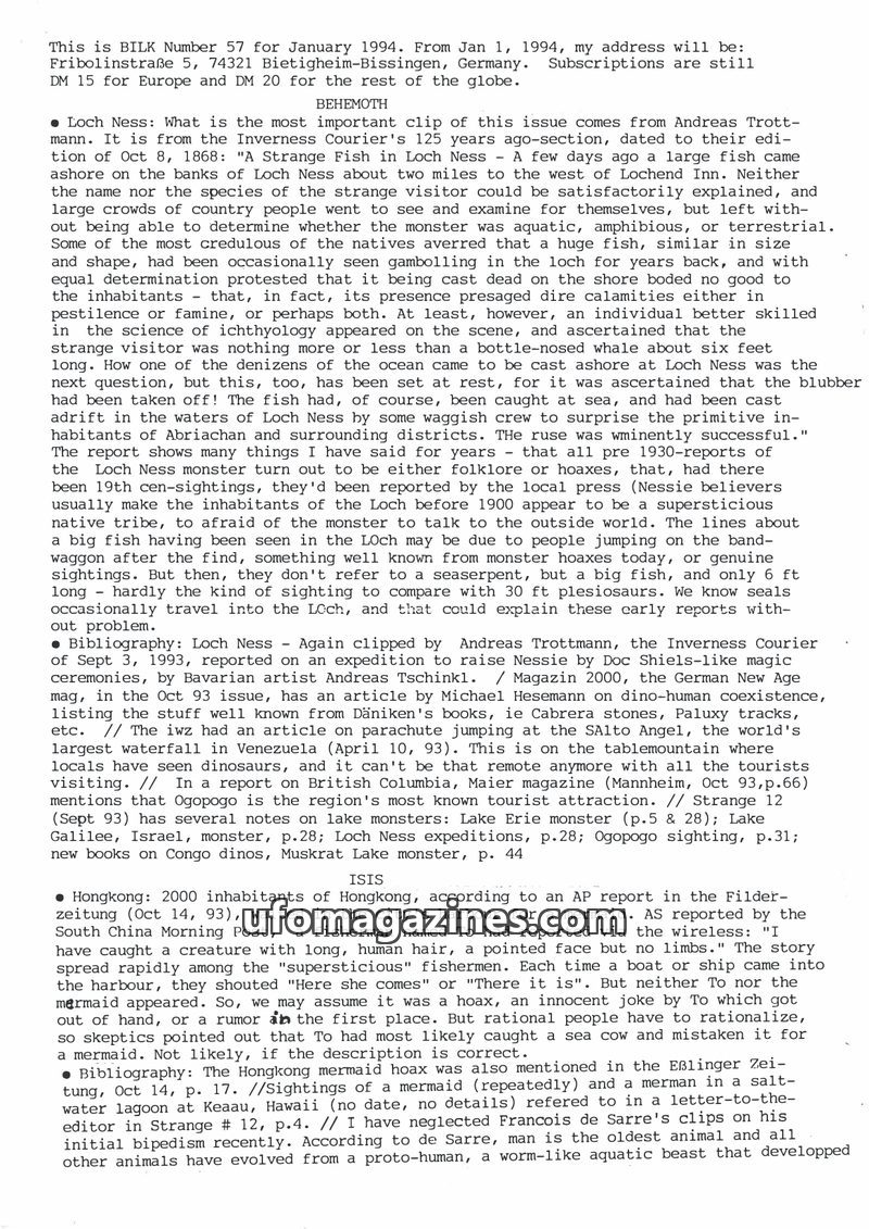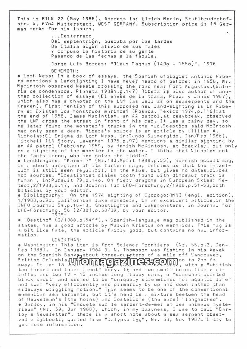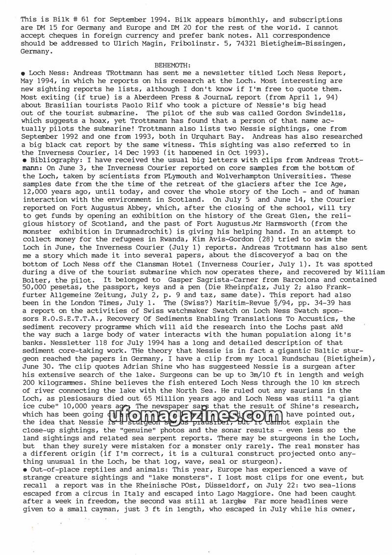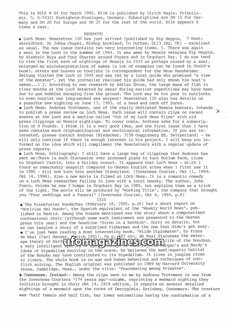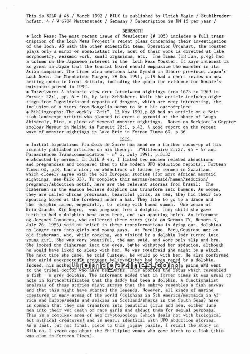 This issue of Bilk Magazine, edited by Ulrich Magin, focuses on water monster sightings and related phenomena. It details reports of a 'Behemoth' in Tibet, Loch Ness and Loch Morar