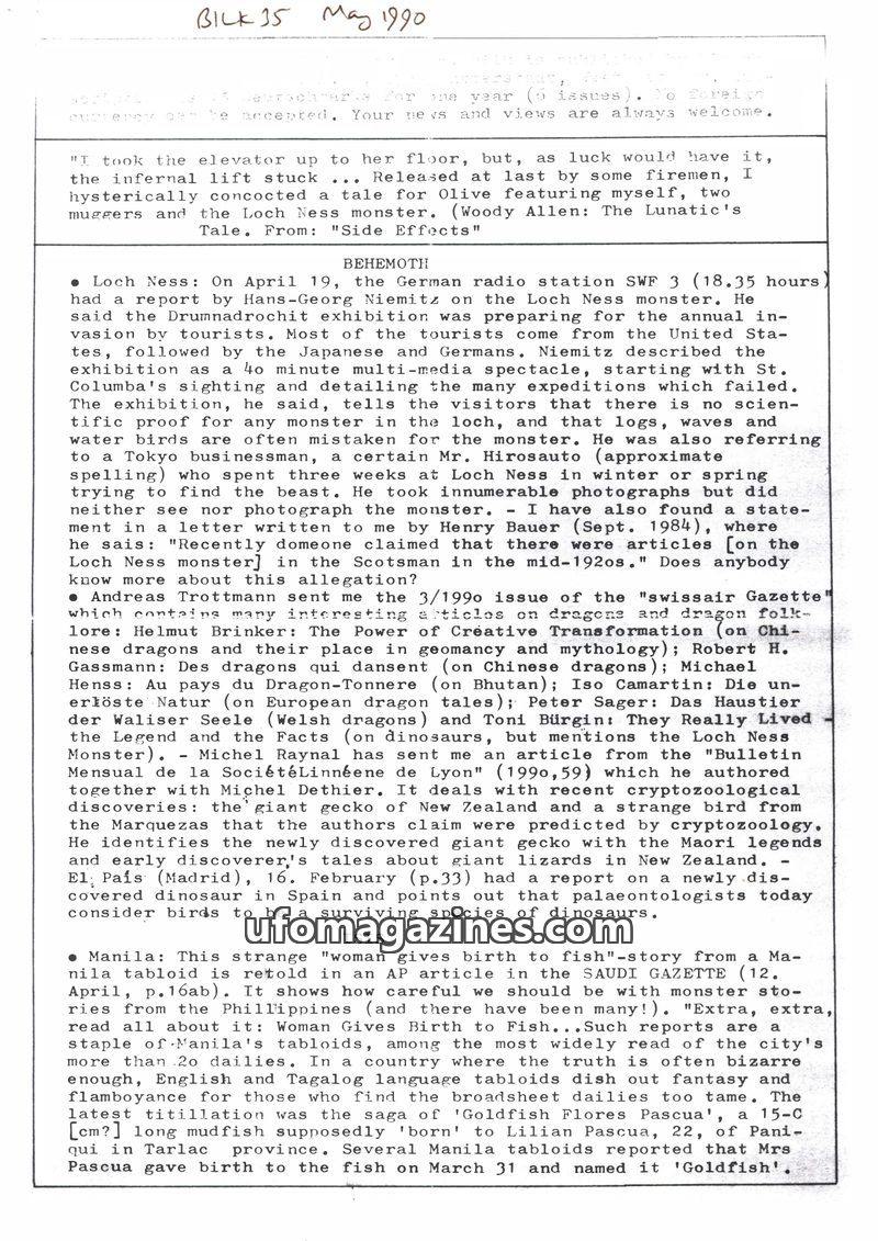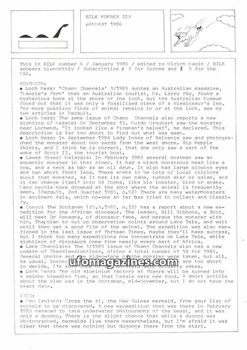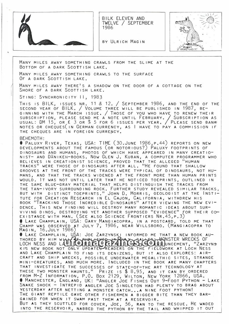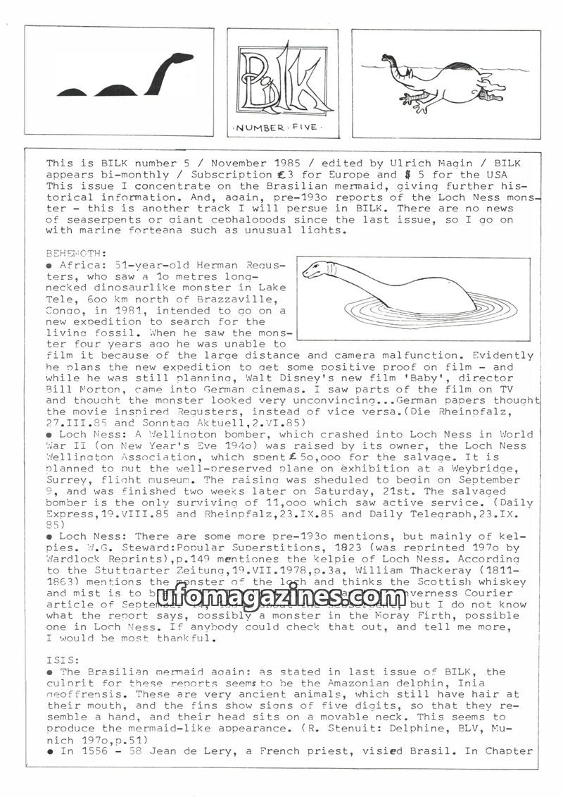 This issue of BILK magazine covers a range of unusual phenomena. It reports on alleged 'behemoth' sightings, including a 'strange beast' in Lake Windermere and a 'living dinosaur'