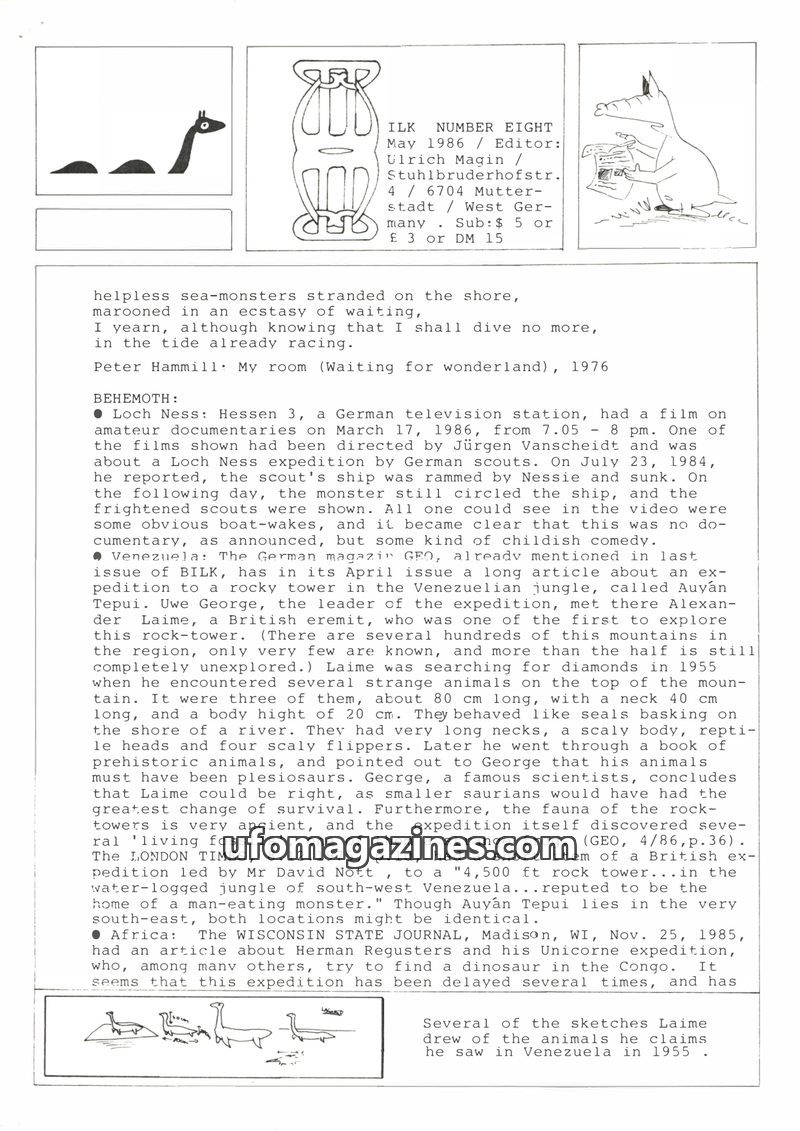 This issue of ILK magazine, dated May 1986, covers various unexplained phenomena and cryptozoological reports. It details alleged sightings of sea monsters in Loch Ness and Venezue