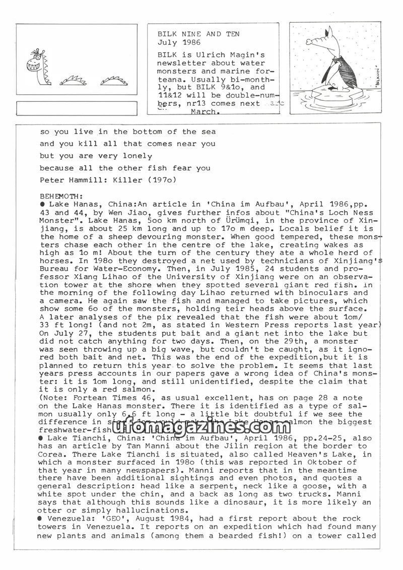 This issue of Bilk, dated July 1986, covers a variety of unexplained phenomena. It details sightings of 'behemoths' in Lake Hanas and Lake Tianchi, China, including descriptions of