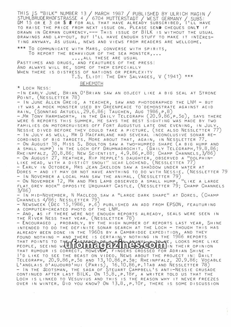 This issue of BILK covers various fortean topics, including inconclusive Loch Ness Monster sightings, a new book on German forteana, a detailed report of a creature sighted at Cham