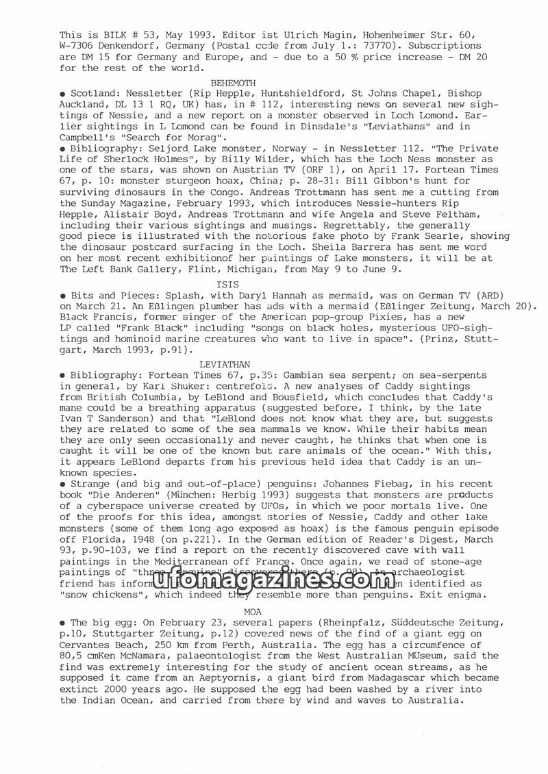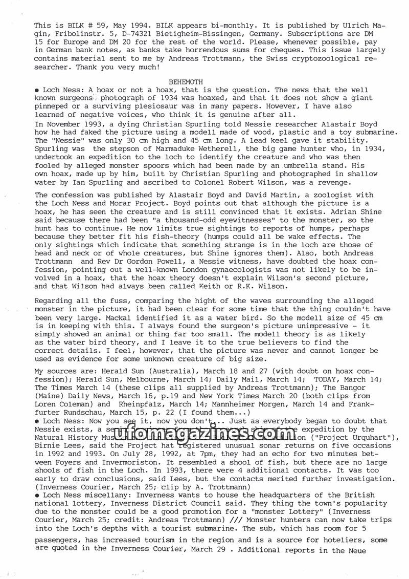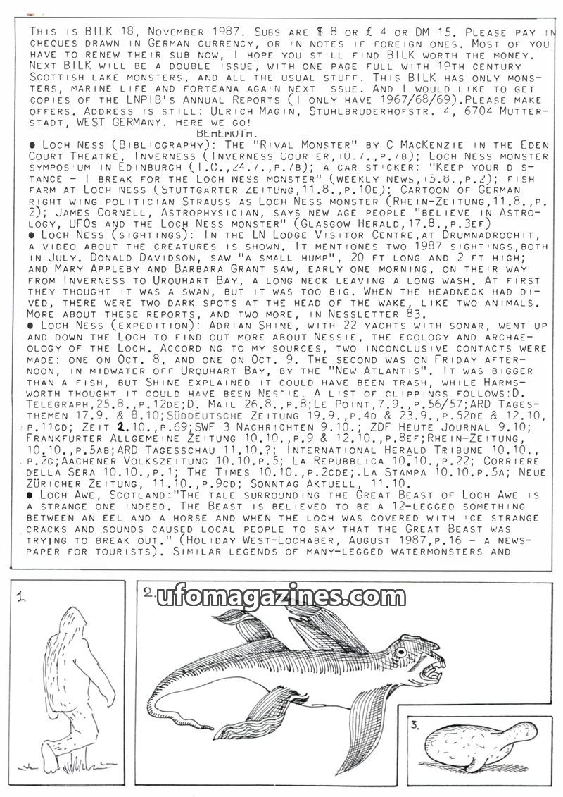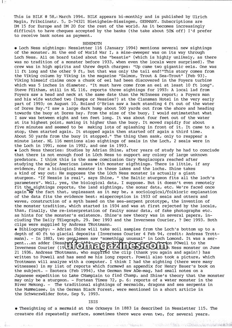 This issue of BILK magazine (March 1994) details numerous Loch Ness monster sightings from early 1993 and discusses Adrian Shine's theory that the creature might be a giant sturgeo