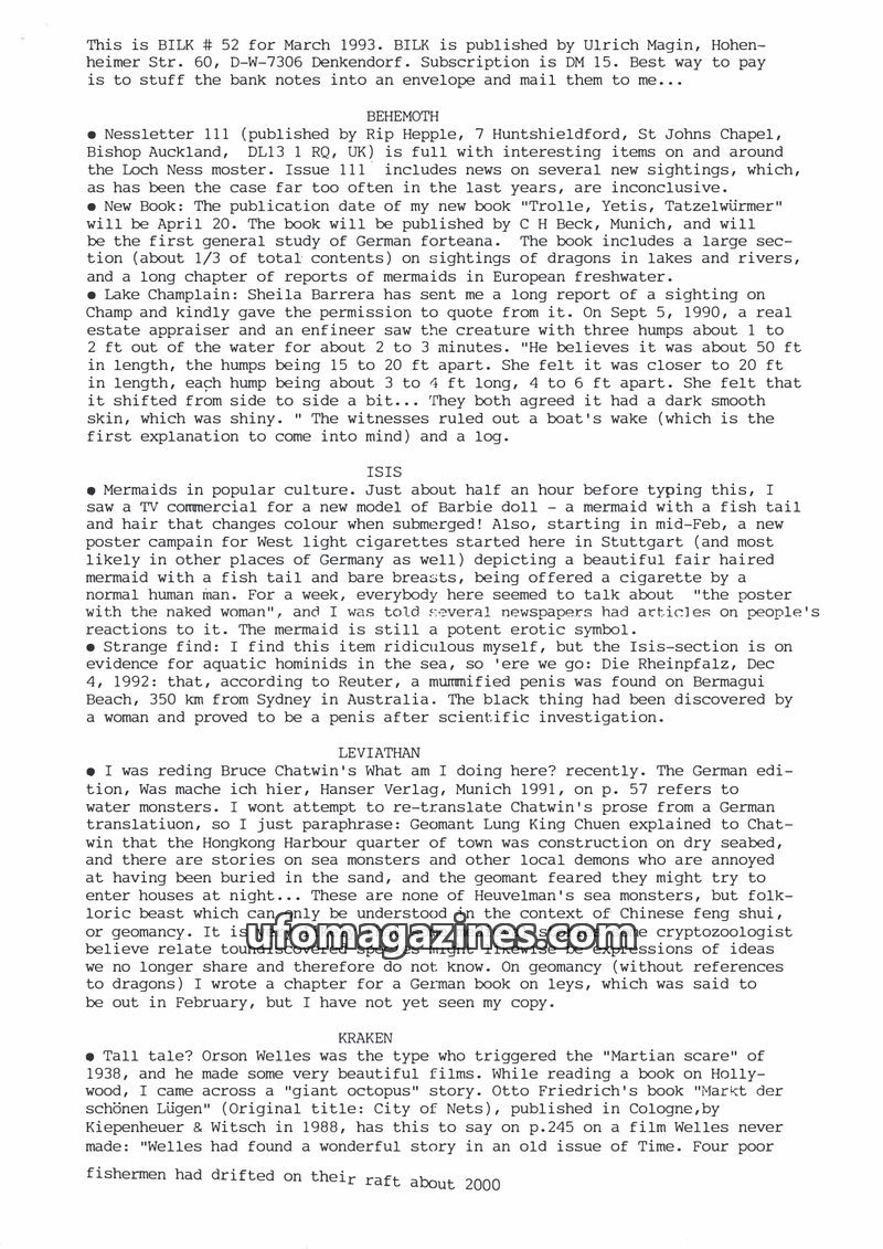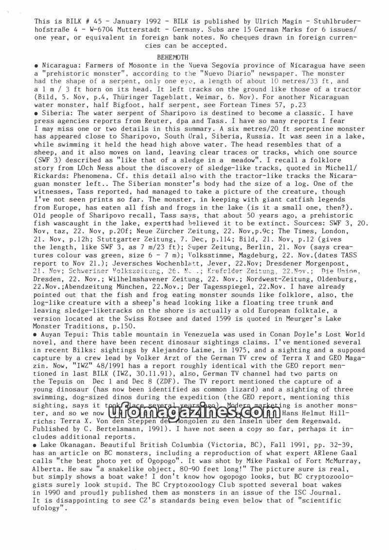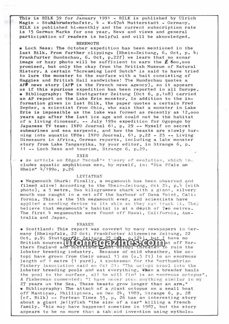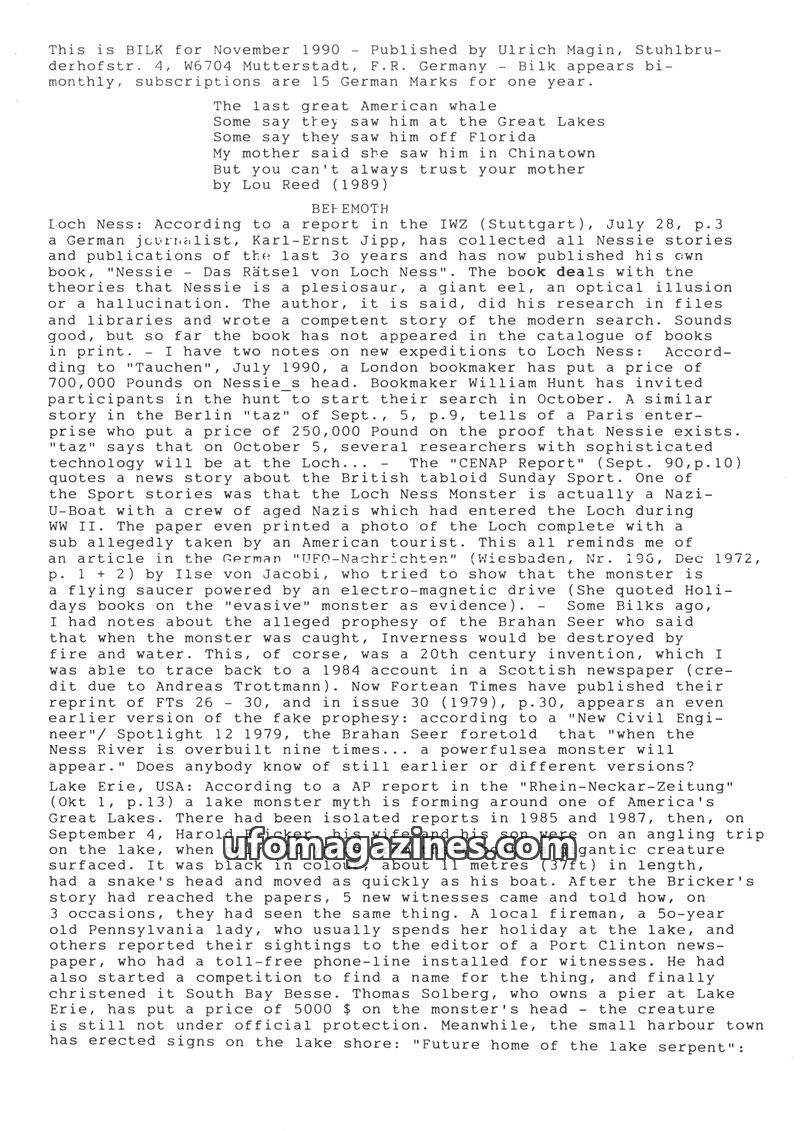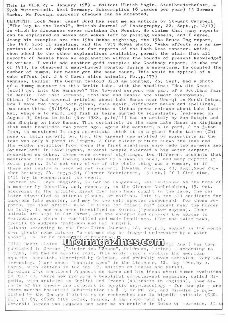 This issue of BILK (November 1991) covers a range of fortean phenomena. It details reports of lake monsters in Germany (Thümmlitzsee and Chiemsee), discusses books on cryptozoology