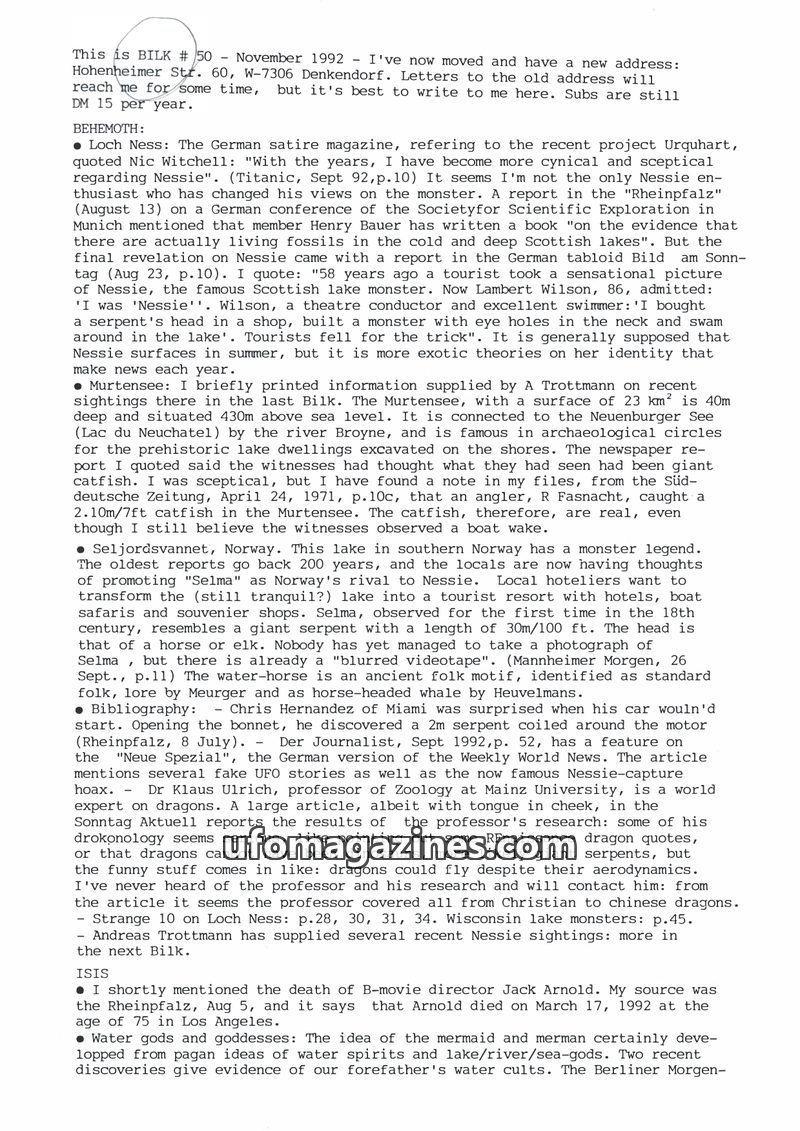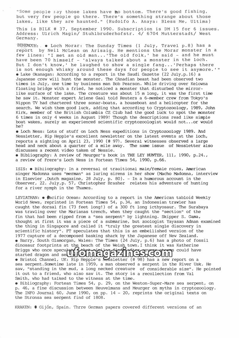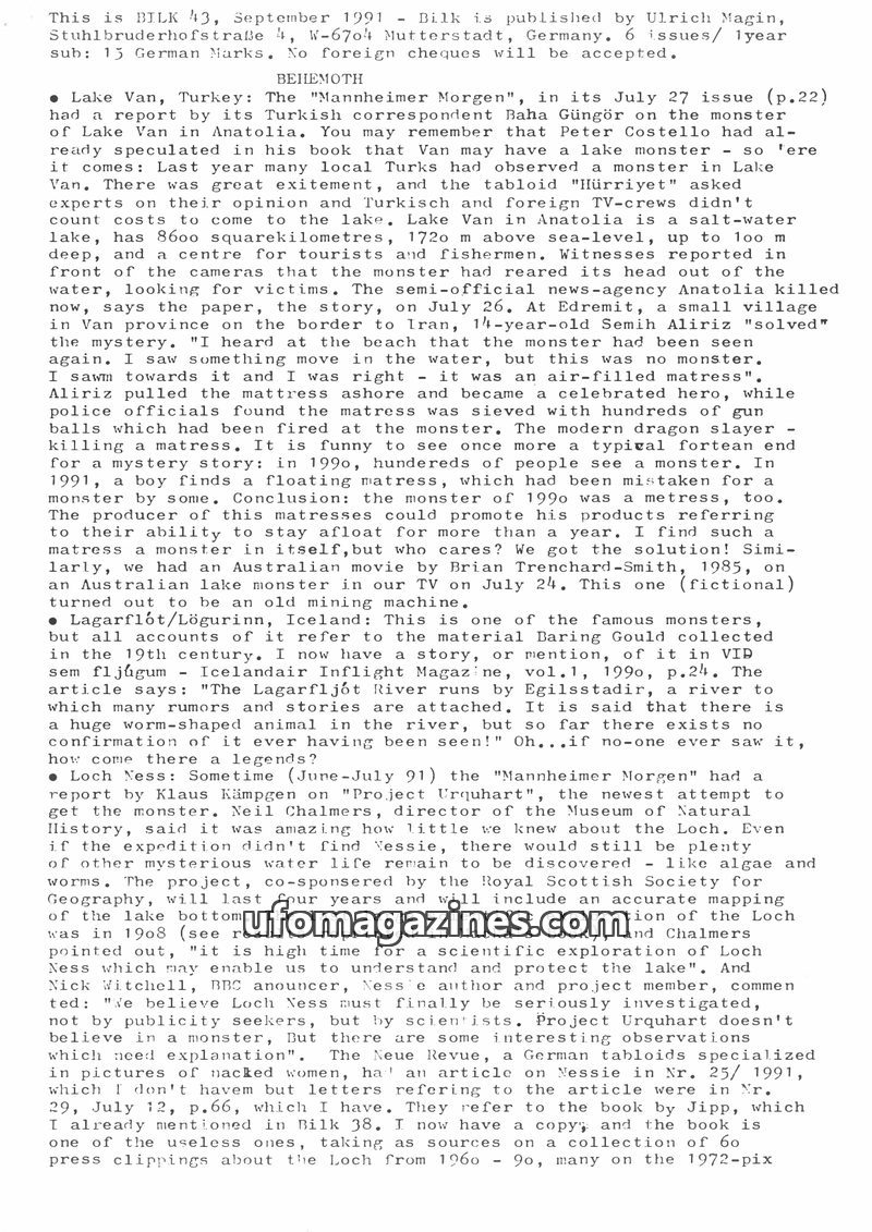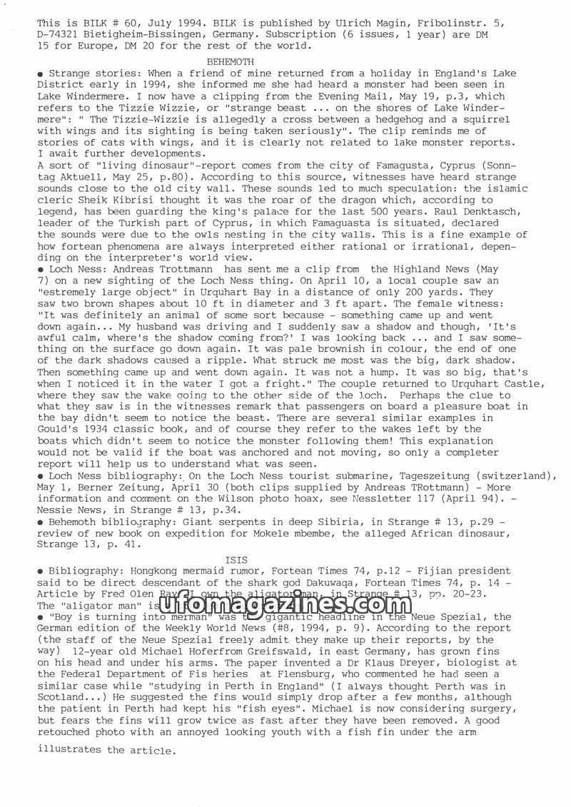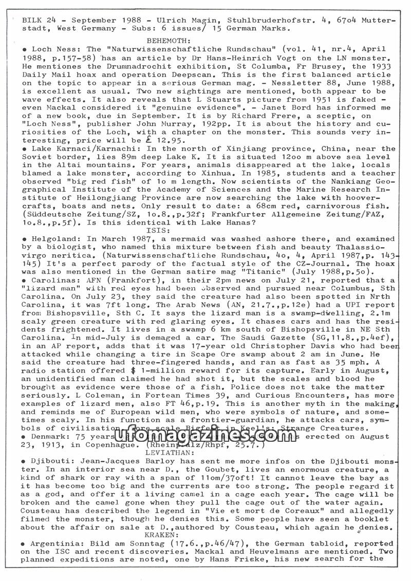This issue of BILK (November 1991) covers a range of fortean phenomena. It details reports of lake monsters in Germany (Thümmlitzsee and Chiemsee), discusses books on cryptozoology