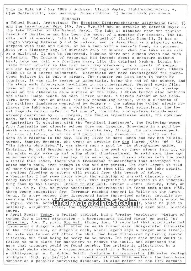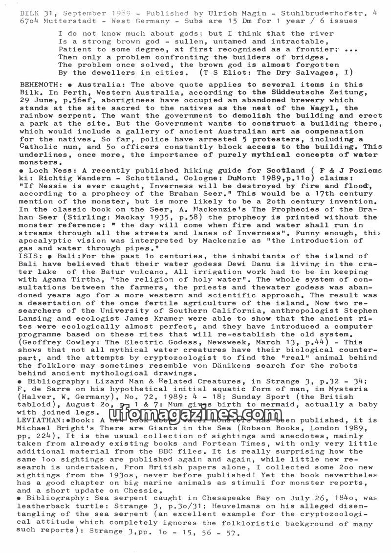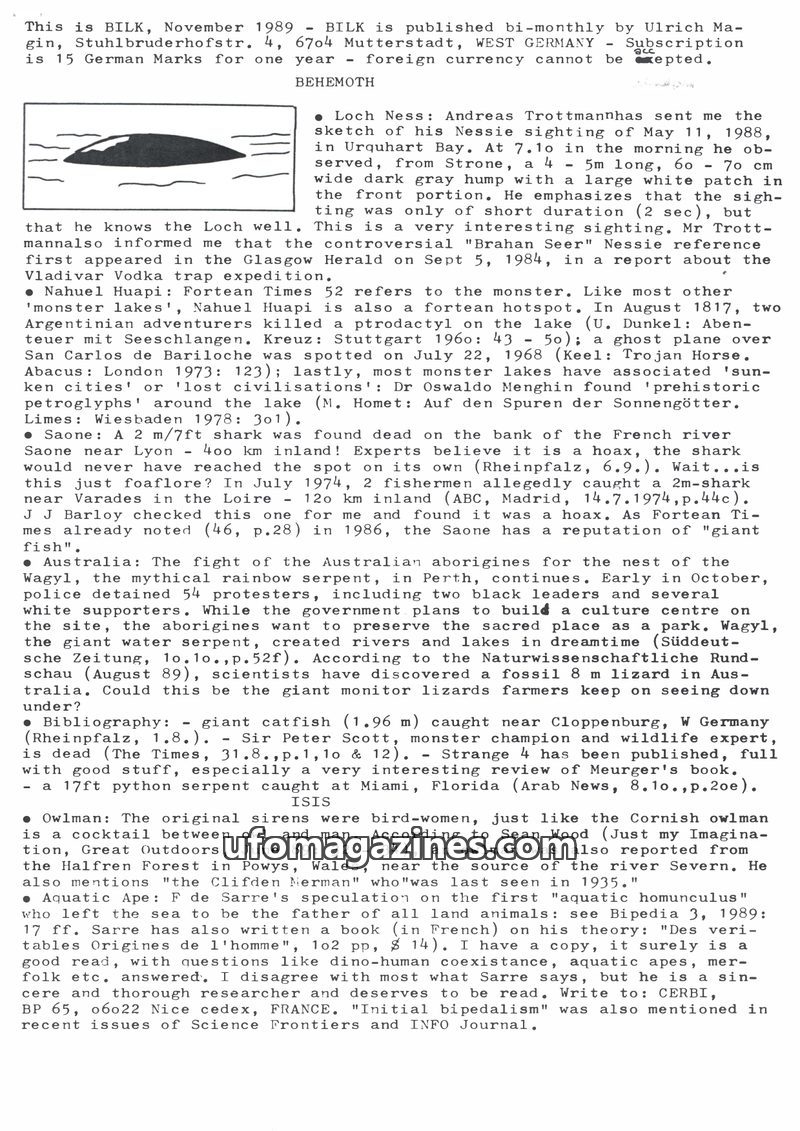 This issue of Bilk, dated May 1989, covers a range of unusual phenomena. It details the Nahuel Huapi lake monster in Argentina, local legends of a rainbow-serpent in Australia, and