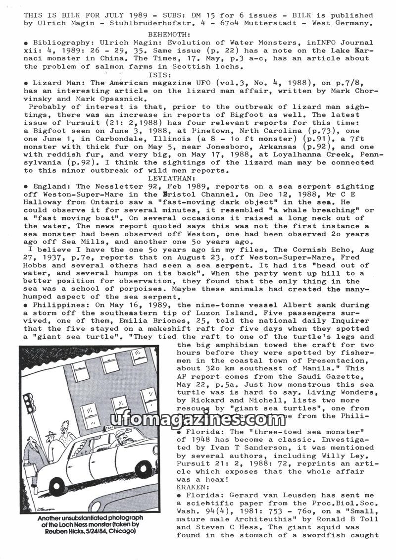 This issue of BILK magazine from July 1989 covers a range of unexplained phenomena. It includes a bibliography on water monsters, reports on Lizard Man and Bigfoot sightings, and a