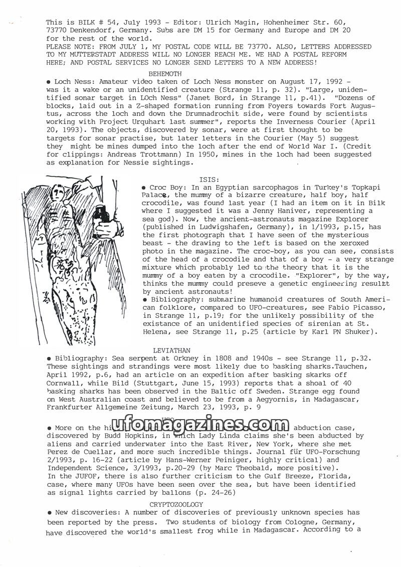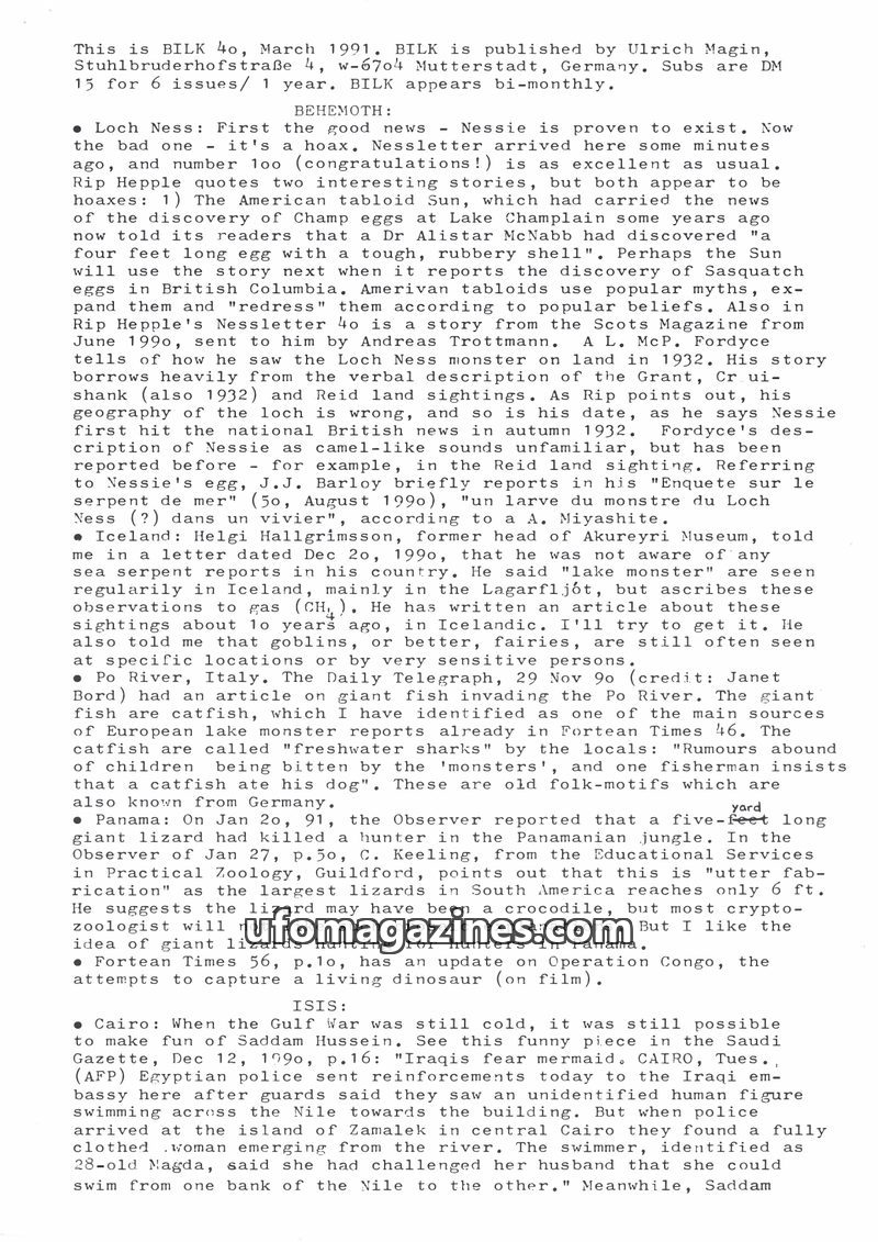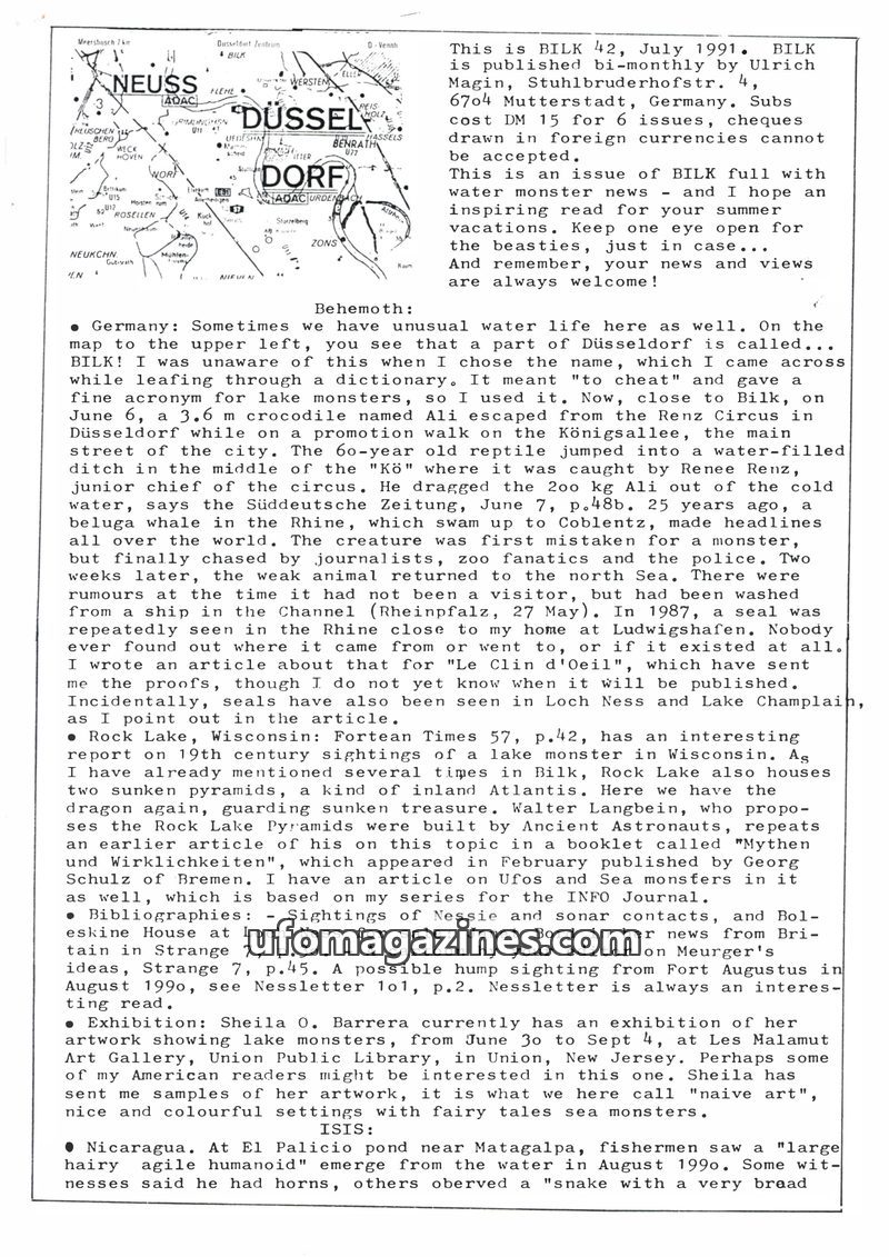 This July 1991 issue of BILK magazine, published bi-monthly by Ulrich Magin, focuses on water monster news and other fortean phenomena. It reports on a crocodile escape in Düsseldo