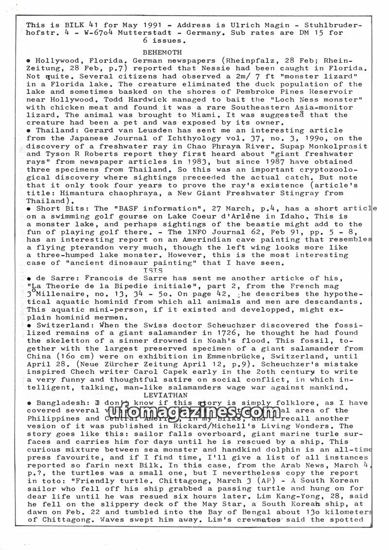 This issue of BILK (May 1991) covers a variety of unusual reports, including a 'monster lizard' caught in Florida, the discovery of a giant freshwater ray in Thailand, and an ancie