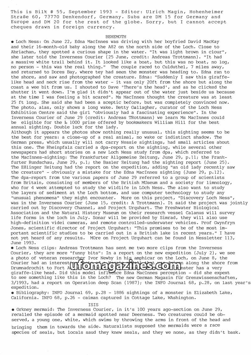 The September 1993 issue of Bilk magazine details a significant Loch Ness Monster sighting by Edna MacInnes on June 22, 1993, who described a large, light brown creature with a gir