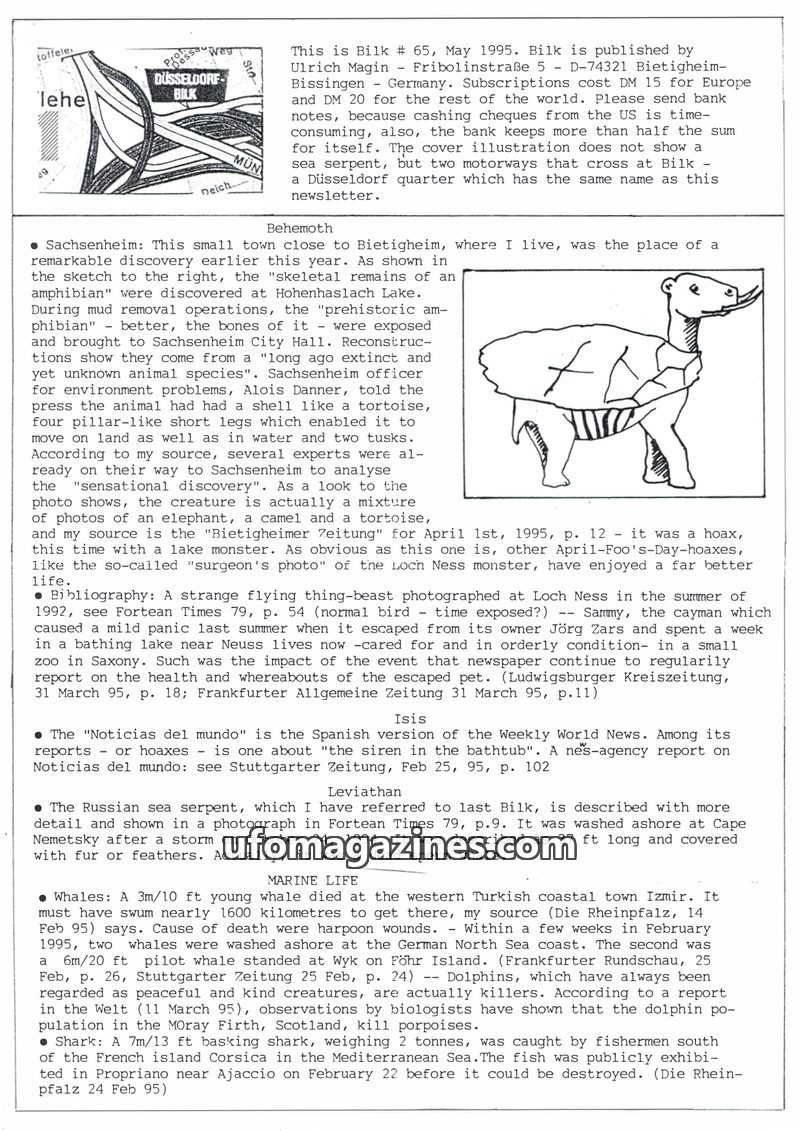 This issue of Bilk reports on various unusual discoveries and phenomena. It covers a hoax 'amphibian' discovery in Sachsenheim, Germany, and mentions a photographed 'flying thing-b