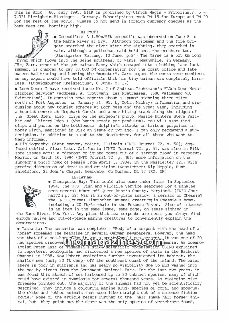 This issue of Bilk (July 1995) covers a range of unusual sightings and discoveries. It reports on a crocodile sighting in France, a 'puma' sighting in Scotland, and the discovery o