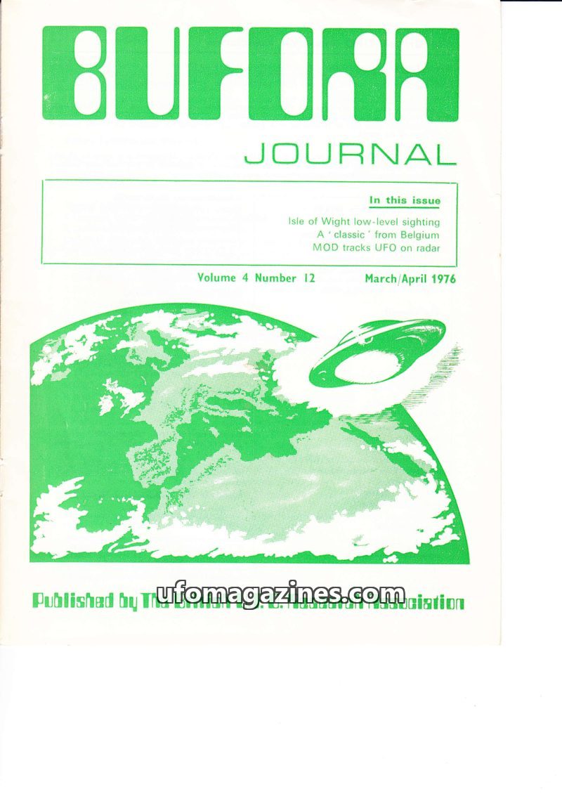 This issue of BUFORA JOURNAL from March/April 1976 covers several UFO-related topics. It details a low-level sighting on the Isle of Wight, including witness accounts and independe