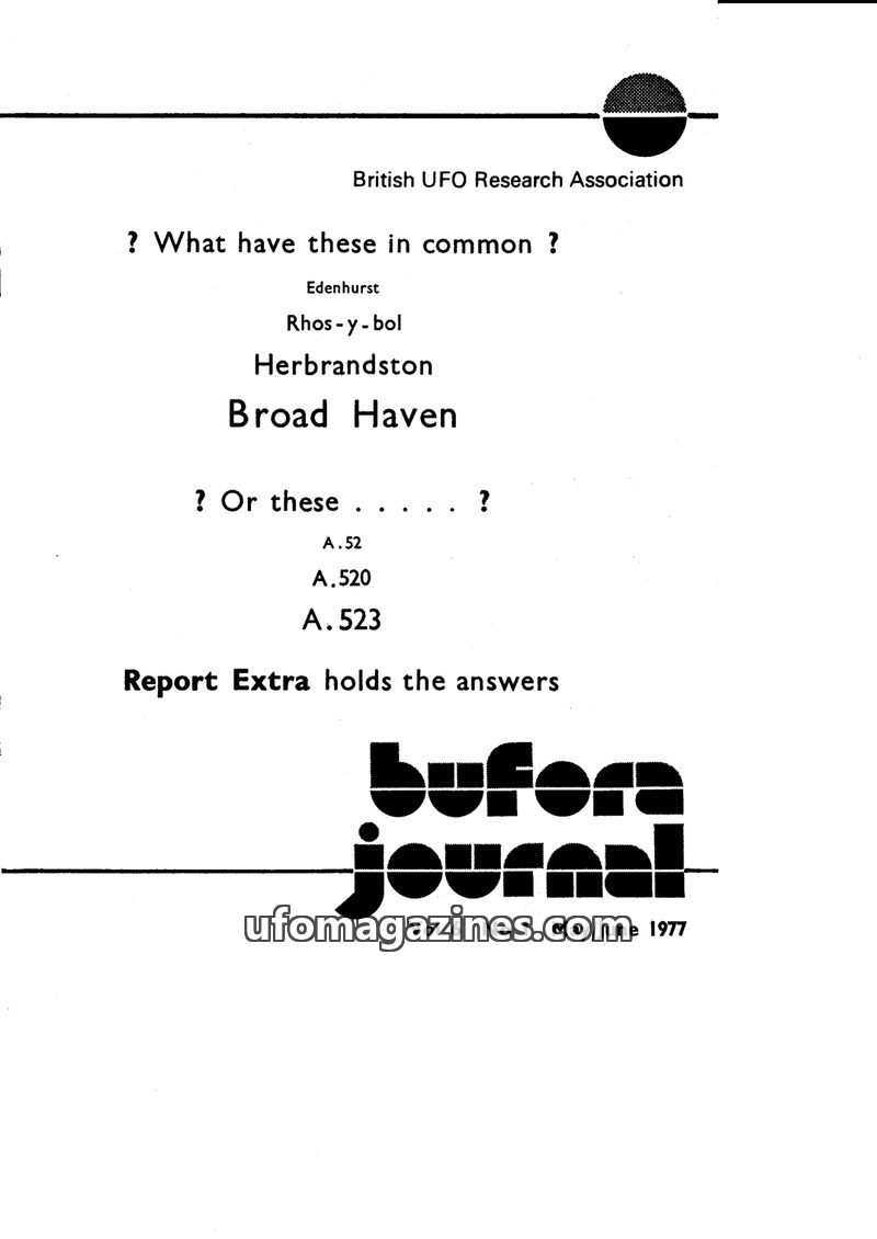 This issue of BUFORA JOURNAL (Vol 6, No 1, May/June 1977) covers the enigmatic Broad Haven incident and other UFO sightings. It features an interview with Dr. J. Allen Hynek, who i