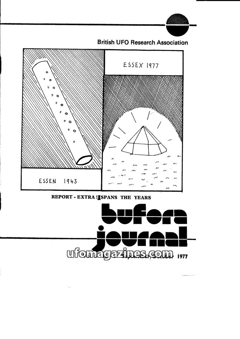 This issue of BUFORA JOURNAL covers a wide range of UFO reports, including a 1943 incident over Essen and various sightings from 1977 across the UK. It also delves into the 'Scient