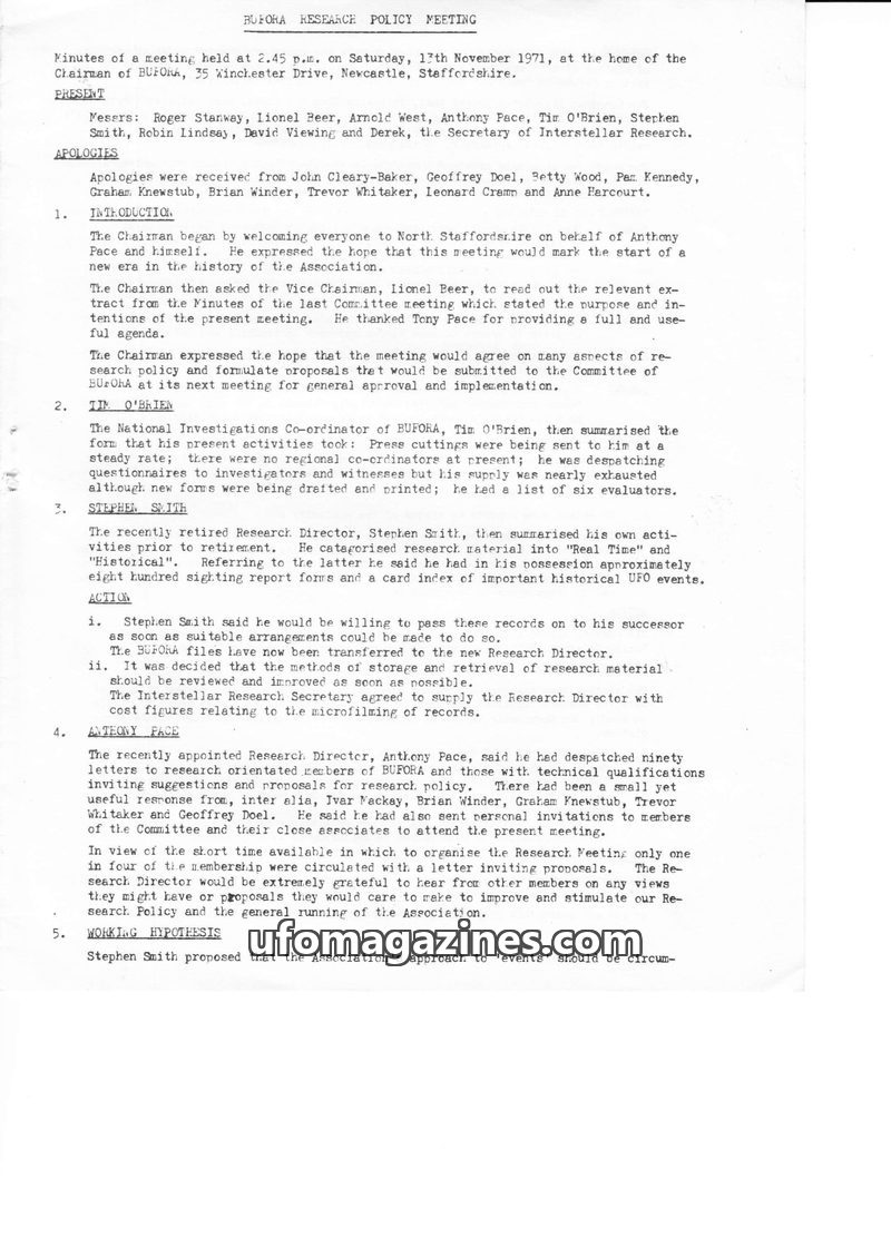 This document details the minutes of a BUFORA Research Policy Meeting held on November 17, 1971. Key discussions included defining the scope of UFO research, improving investigatio