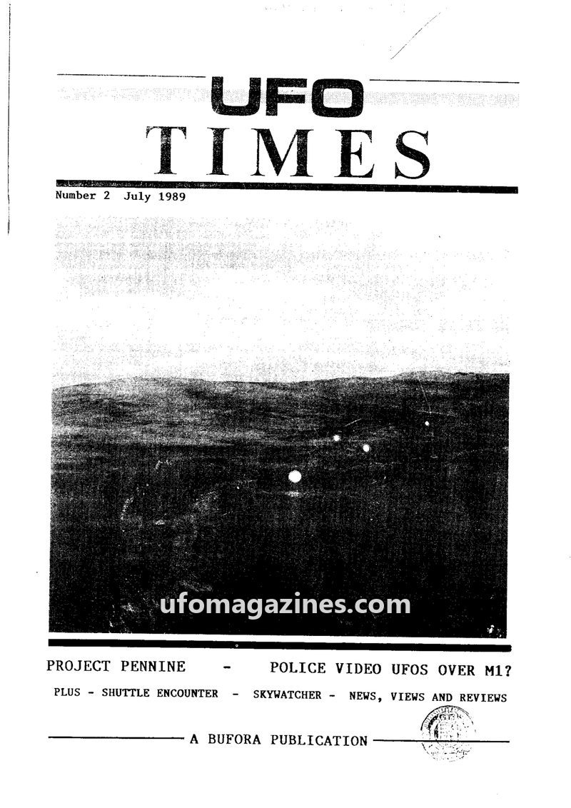 This issue of UFO Times from July 1989 focuses on UFO sightings and research within the UK. A key article investigates a police video of UFOs over the M1 motorway, detailing witnes