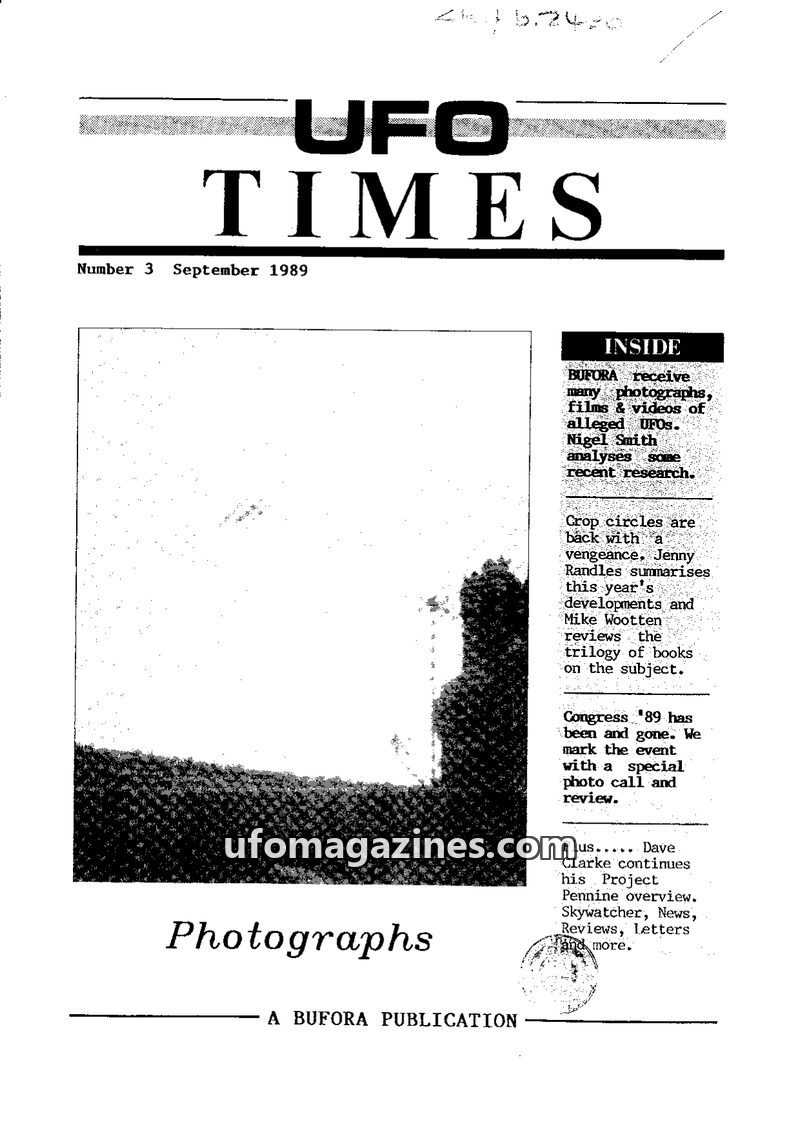 This issue of UFO Times, published in September 1989, focuses on photographic evidence and research methodology. It discusses the challenges of analyzing UFO photographs, including